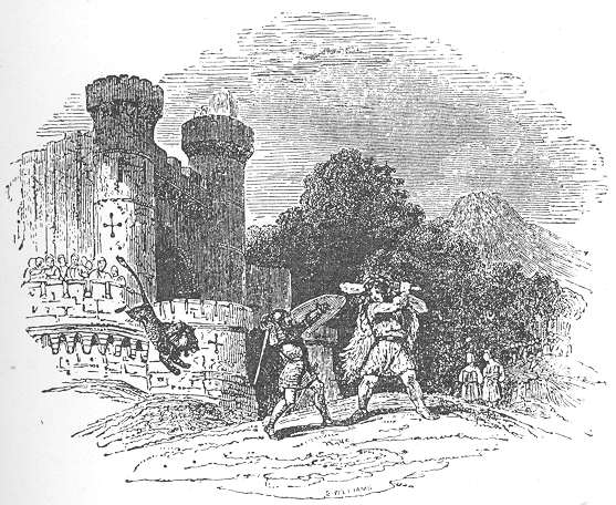 On the morrow, with the dawn of day, he put on his armour, and mounted his charger, and travelled through distant lands, and over desert mountains. And at length he arrived at the valley which Kynon had described to him; and he was certain that it was the same that he sought. And journeying along the valley, by the side of the river, he followed its course till he came to the plain, and within sight of the Castle. When he approached the Castle, he saw the youths shooting their daggers, in the place where Kynon had seen them; and the yellow man, to whom the Castle belonged, standing hard by. And no sooner had Owain saluted the yellow man, than he was saluted by him in return.
