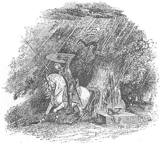 “So I journeyed on, until I reached the summit of the steep. And there I found every thing, as the black man had described it to me. And I went up to the tree, and beneath it I saw the fountain, and by its side the marble slab; and the silver bowl, fastened by the chain. Then I took the bowl, and cast a bowlful of water upon the slab; and thereupon behold the thunder came, much more violent than the black man had led me to expect; and after the thunder came the shower; and of a truth I tell thee, Kai, that there is neither man nor beast that could p. 23endure that shower and live. For not one of those hailstones would be stopped either by the flesh, or by the skin, until it had reached the bone. I turned my horse’s flanks towards the shower, and placed the beak of my shield over his head and neck, while I held the upper part of it over my own head. And thus I withstood the shower. When I looked on the tree, there was not a single leaf upon it, and then the sky became clear; and with that, behold the birds lighted upon the tree, and sang. And truly, Kai, I never heard any melody equal to that, either before or since. And when I was most charmed with listening to the birds, lo, a murmuring voice was heard through the valley, approaching me, and saying, ‘Oh, Knight, what has brought thee hither? What evil have I done to thee, that thou shouldest act towards me and my possessions, as thou hast this day? Dost thou not know that the shower to-day has left in my dominions neither man nor beast alive, that was exposed to it?’ And thereupon, behold a Knight on a black horse appeared, clothed in jet black velvet, and with a tabard of black linen about him. And we charged each other; and as the onset was furious, it was not long before I was overthrown. Then the Knight passed the shaft of his lance through the bridle rein of my horse, and rode off with the two horses; leaving me where I was. And he did not even bestow so much notice upon me, as to imprison me, nor did he despoil me of my arms. So I returned along the road by which I had come. And when I reached the glade where the black man was, I confess to thee, Kai, it is a marvel that I did not melt down into a liquid pool, through the shame that I felt at the black man’s derision. And that night I came to the same Castle, where I had spent the night preceding. p. 24And I was more agreeably entertained that night, than I had been the night before; and I was better feasted, and I conversed freely with the inmates of the Castle; and none of them alluded to my expedition to the fountain, neither did I mention it to any. And I remained there that night. When I arose on the morrow, I found ready saddled a dark-bay palfrey, with nostrils as red as scarlet. And after putting on my armour, and leaving there my blessing, I returned to my own Court. And that horse I still possess, and he is in the stable yonder. And I declare that I would not part with him for the best palfrey in the Island of Britain.