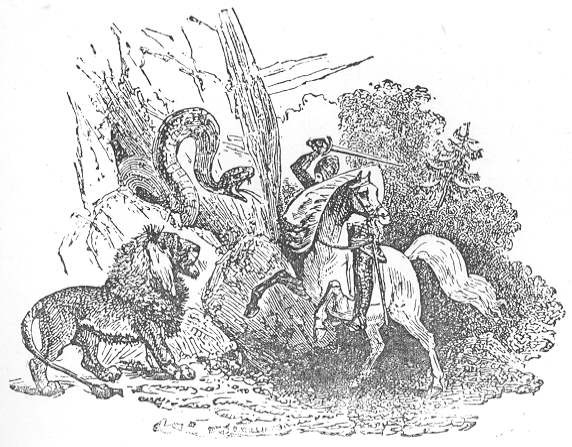 And as he journeyed, he heard a loud yelling in a wood. And it was repeated a second and a third time. And Owain went towards the spot, and behold a huge craggy mound, in the middle of the wood; on the side of which was a grey rock. And there was a cleft in the rock, and a serpent was within the cleft. And near the rock, stood a black lion, and every time the lion sought to go thence, the serpent darted towards him to attack him. And Owain unsheathed his sword, and drew near to the rock; and as the serpent sprung out, he struck him with his sword, and cut him in two. And he dried his sword, and went on his way, as before. But behold the lion followed him, and played about him, as though it had been a greyhound, that he had reared.