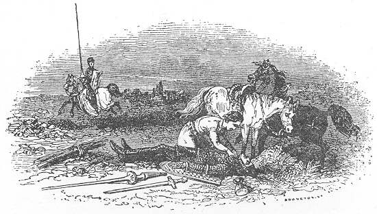 Then they beheld another troop coming towards the ford, and these from their horses’ chests upwards were whiter than the lily, and below blacker than jet. And they saw one of these knights go before the rest, and spur his horse into the ford in such a manner that the water dashed over Arthur and the Bishop, and those holding counsel with them, so that they were as wet as if they had been drenched in the river. And as he turned the head of his horse, the youth who stood before Arthur struck the horse over the nostrils with his sheathed sword, so that had it been p. 114with the bare blade it would have been a marvel if the bone had not been wounded as well as the flesh. And the knight drew his sword half out of the scabbard, and asked of him, “Wherefore didst thou strike my horse? Whether was it in insult or in counsel unto me?” “Thou dost indeed lack counsel. What madness caused thee to ride so furiously as to dash the water of the ford over Arthur, and the consecrated Bishop, and their counsellors, so that they were as wet as if they had been dragged out of the river?” “As counsel then will I take it.” So he turned his horse’s head round towards his army.