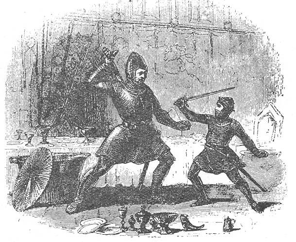 And behold in the second year a tumult arose in Ireland, on account of the insult which Matholwch had received in Wales, and the payment made him for his horses. And his foster-brothers, and such as were nearest unto him, blamed him openly [48a] for that matter. And he might have no peace by reason of the tumult until they should revenge upon him this disgrace. And the vengeance which they took was to drive away Branwen from the same chamber with him, and to make her cook [48b] for the court; and they p. 49caused the butcher, after he had cut up the meat, to come to her and give her every day a blow on the ear, and such they made her punishment.