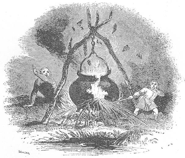 Then the Irish kindled a fire under the cauldron of renovation, and they cast the dead bodies into the cauldron until it was full, and the next day they came forth fighting men as good as before, except that they were not able to speak. Then when Evnissyen saw the dead bodies of the men of the Island of the Mighty nowhere resuscitated, he said in his heart, “Alas! woe is me, that I should have been the cause of bringing the men of the Island of the Mighty into so great a strait. Evil betide me if I find not a deliverance therefrom.” And he cast himself among the dead bodies of the Irish, and p. 56two unshod Irishmen came to him, and, taking him to be one of the Irish, flung him into the cauldron. And he stretched himself out in the cauldron, so that he rent the cauldron into four pieces, and burst his own heart also.