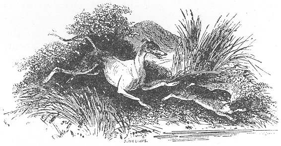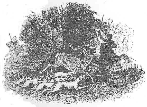 And he beheld a glade in the wood forming a level plain, and as his dogs came to the edge of the glade, he saw a stag before the other dogs. And lo, as it reached the middle of the glade, the dogs that followed the stag overtook it, and brought it down. Then looked he at the colour of the dogs, staying not to look at the stag, and of all the hounds that he had seen in the world, he had never seen any that were like unto those. For their hair was of a brilliant shining white, and their ears were red; and as the whiteness of their bodies shone, so did the redness of their ears glisten. And he came towards the dogs, and drove away those that had brought down the stag, and set his own dogs upon it.