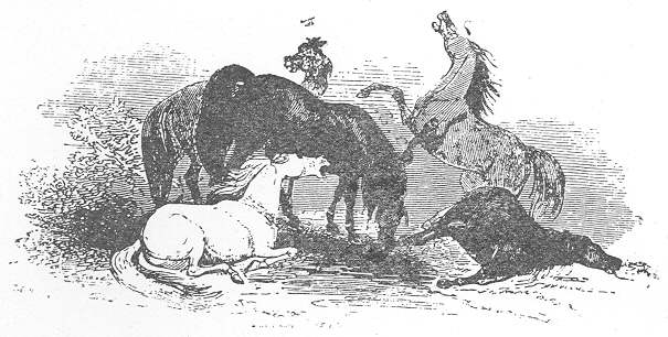 And behold one day, Evnissyen, the quarrelsome man of whom it is spoken above, came by chance into the place, where the horses of Matholwch were, and asked whose horses they might be. “They are the horses of Matholwch king of Ireland, who is married to Branwen, thy sister; his horses are they.” “And is it thus they have done with a maiden such as she, and moreover my sister, bestowing her without my consent? They could have offered no greater insult to me than this,” said he. And thereupon he rushed under the horses and cut off their lips at the teeth, and their ears close to their heads, and their tails [42] close to their backs, and wherever he could clutch their eyelids, he cut them to the very bone, and he disfigured the horses and rendered them useless.