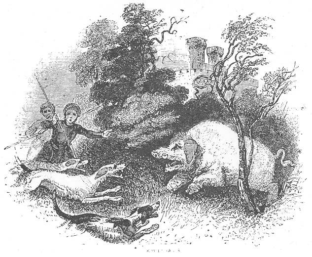 Pwyll, prince of Dyved, was lord of the seven Cantrevs of Dyved; and once upon a time he was at Narberth his chief palace, and he was minded to go and hunt, and the part of his dominions in which it pleased him to hunt was Glyn Cuch. So he set forth from Narberth that night, and went as far as Llwyn Diarwyd. [11a] And that night he tarried there, and early [11b] on the morrow he rose and came to Glyn p. 12Cuch; when he let loose the dogs in the wood, and sounded the horn, and began the chace. And as he followed the dogs, he lost his companions; and whilst he listened to the hounds, he heard the cry of other hounds, a cry different from his own, and coming in the opposite direction.