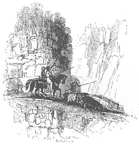 p. 20And he took a horse and went forward. And he came to an open level plain, and put spurs to his horse; and the more he urged his horse, the further was she from him. Yet she held the same pace as at first. And his horse began to fail; and when his horse’s feet failed him, he returned to the place where Pwyll was. “Lord,” said he, “it will avail nothing for any one to follow yonder lady. I know of no horse in these realms swifter than this, and it availed me not to pursue her.” “Of a truth,” said Pwyll, “there must be some illusion here. Let us go towards the palace.” So to the palace they went, and they spent that day. And the next day they arose, and that also they spent until it was time to go to meat. And after the first meal, “Verily,” said Pwyll, “we will go the same party as yesterday to the top of the mound. And do thou,” said he to one of his young men, “take the swiftest horse that thou knowest in the field.” And thus did the young man. And they went towards the mound, taking the horse with them. And as they were sitting down they beheld the lady on the same horse, and in the same apparel, coming along the same road. “Behold,” said Pwyll, “here is the lady of yesterday. Make ready, youth, to learn who she is.” “My Lord,” said he, “that will I gladly do.” And thereupon the lady came opposite to them. So the youth mounted his horse; and before he had settled himself in his saddle, she passed by, and there was a clear space between them. But her speed was no greater than it had been the day before. Then he put his horse into an amble, and thought that notwithstanding the gentle pace at which his horse went, he should soon overtake her. But this availed him not; so he gave p. 21his horse the reins. And still he came no nearer to her than when he went at a foot’s pace. And the more he urged his horse, the further was she from him. Yet she rode not faster than before. When he saw that it availed not to follow her, he returned to the place where Pwyll was. “Lord,” said he, “the horse can no more than thou hast seen.” “I see indeed that it avails not that any one should follow her. And by Heaven,” said he, “she must needs have an errand to some one in this plain, if her haste would allow her to declare it. Let us go back to the palace.” And to the palace they went, and they spent that night in songs and feasting, as it pleased them.