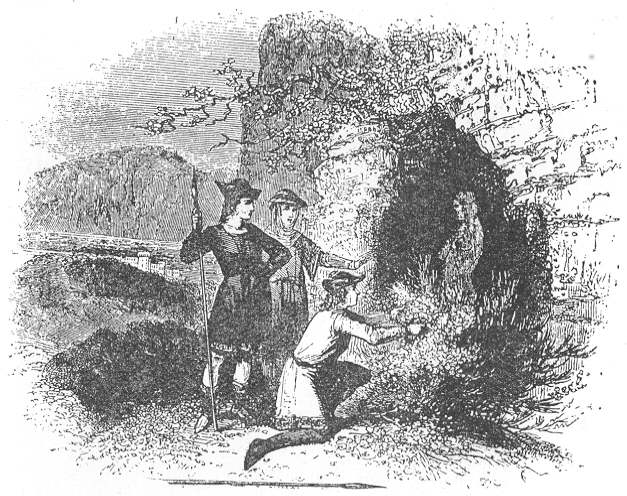 Then they went on to Harlech, and there stopped to rest, and they provided meat and liquor, and sat down to eat and to drink. And there came three birds, and began singing unto them a certain song, and all the songs they had ever heard were unpleasant p. 58compared thereto; and the birds seemed to them to be at a great distance from them over the sea, yet they appeared as distinct as if they were close by; and at this repast they continued seven years.