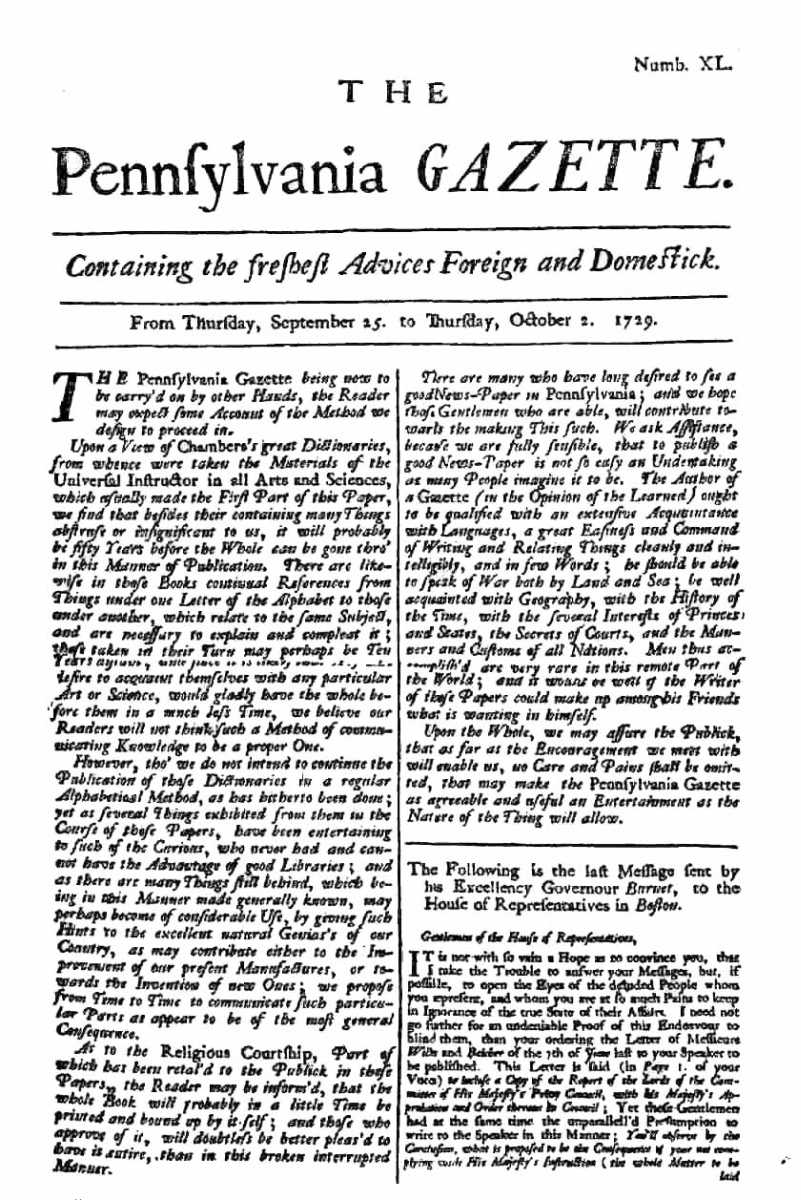 Pages 1 and 4 of The Pennsylvania Gazette, Number XL, the first number after Franklin took control |