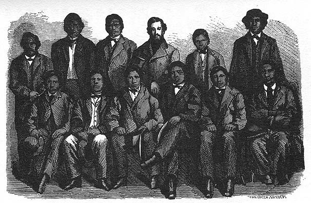 Good rounds of hand-shaking indulged in, many questions were put and answered through the interpreters, and a careful examination was made of the hair-dressing, the paint on the cheeks, the beads, tin ornaments of the Indians, and the sparkling diamonds of our own people. The wonder, remarks, and laughter of each party, as something struck them as singular or ludicrous, were going on all over the room; for the order was soon broken up, and all mixed in, pale-faces and Indian alike, quite indiscriminately.