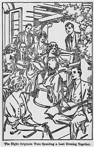 It was a warm night in September. Miriam Nesbit and seven of the Eight Originals were spending a last evening together on the Harlowes' hospitable veranda. They were on the eve of separation. The following day would witness Nora's and Jessica's departure for the conservatory. Grace and Miriam would return to Overton at the beginning of the next week, and the latter part of the same week would find the four young men entered upon their senior year in college.