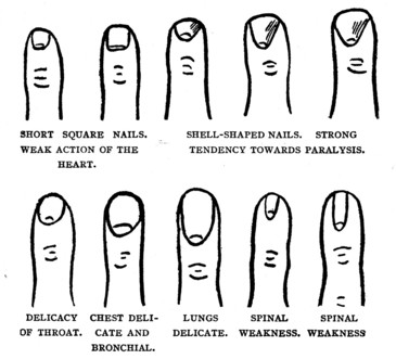 The shorter and more thick-set the nail phalange is, giving the appearance of a club, the more ungovernable is the person in his or her temper. Such people have no control over themselves and under the least opposition will fly into a blind rage of fury. This curious formation has been called the "Murderer's Thumb" because so many who have committed murder in a mad fit of passion have been found with this curious formation.