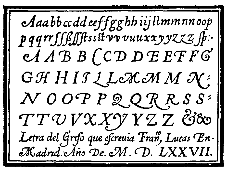 54 Spanish Italic Pen Drawn Letters. By Francisco Lucas. From 'Arte de Escrēvirde.' (Madrid, 1577)
