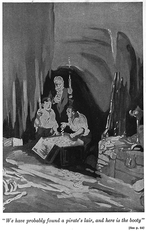 The couch in the recess. Chests of gold. A pirates' lair. The ancient coins. Peculiar articles of ornament. The lid with mocking lock. Rings; bracelets. The buccaneers. The sermon. Ghastly relics. A perceptible movement in the atmosphere. Startling supposition. A possible outlet in the side of the hill. The slab of carbonate. The writing on it. An accident and the finding of other skeletons. The light shining into the cave. Discovery of the outlet. View of the cataract from the opening in the hillside. The boat in the cave. Taking it out by the hillside opening. The Professor's search. Return of the boys with the team. Re-enter the cave. The Professor lost. Hunting in the unknown passages. Return of the Professor. Taking two of the skeletons to the laboratory.