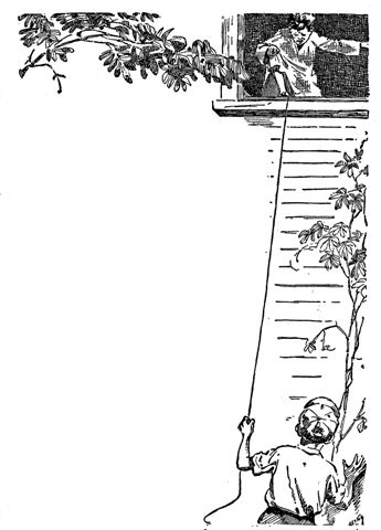 He fumbled momentarily along the dark sidewall, yanked at a cord which swayed idly to and fro with each light air current, and gazed expectantly upward. Nothing happened. Again a jerk, given this time with a certain vindictive delight. A muffled "Ouch!" came from the open window as a splotch of animated white appeared indistinctly behind the dark screen.
