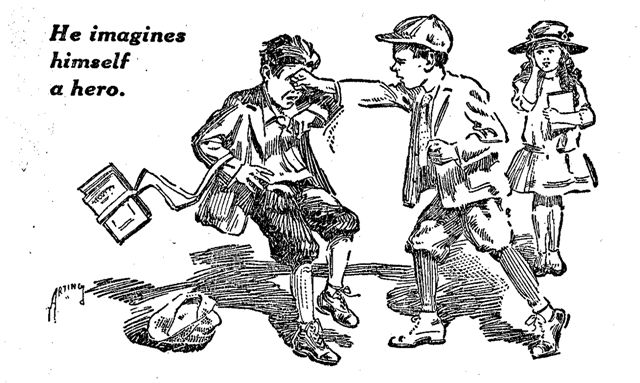 John's face set. All the wrongs which Sid had perpetrated since the Halloween party—the earlier sodas, the persistence which had culminated in the theater affair, the baseball election, and his arrogance since that time—clamored for revenge. He'd get even, he would. He'd go back and punch Sid's face in, and muss that new suit, and throw his baseball gloves up on a house roof. Then Mr. Sid would quit monkeying with his girl.