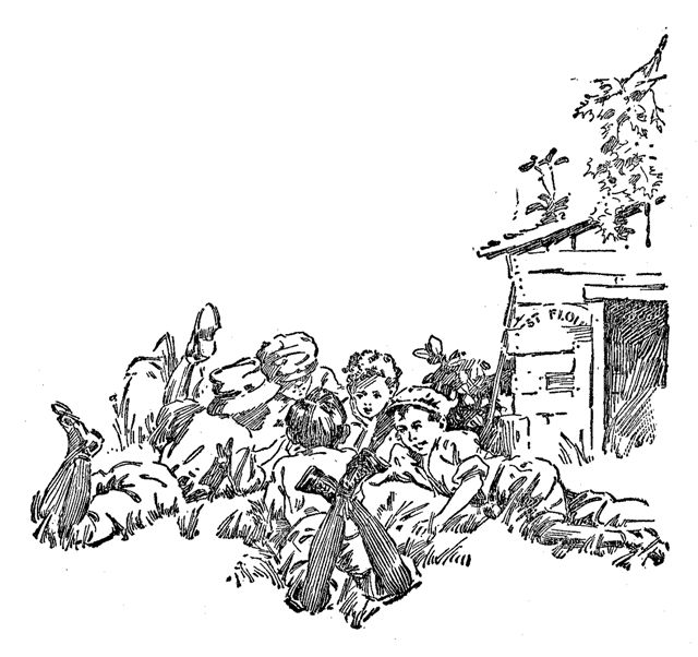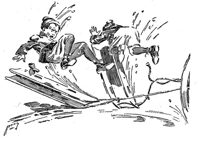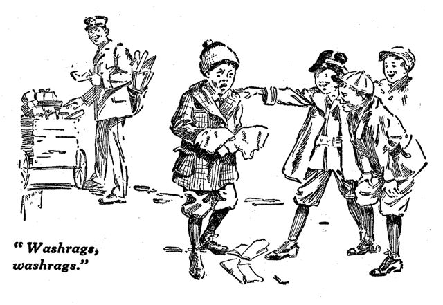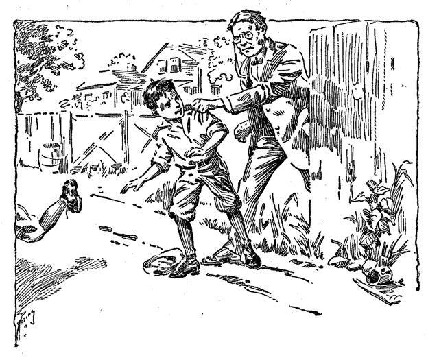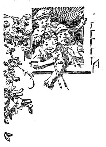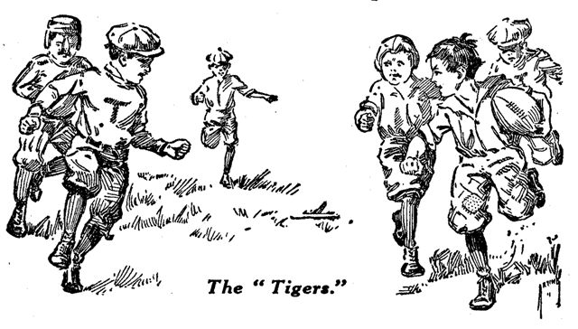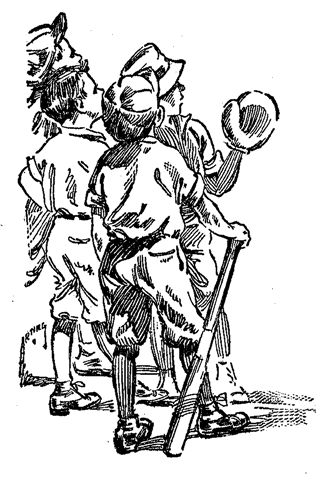 Nine o'clock in the morning saw the "Tigers" assembled in front of the Silvey home. Sid wore his elaborate outfit; Bill, the ragged football trousers which had done duty in the autumn, and John sported a battered cap. Other uniforms among them there were not, but the team made a brave showing, nevertheless, as it trooped lustily toward the corner. No scampering across the railroad embankment this time for the members. A baseball game demanded a more ceremonious arrival on the grounds. They neared the viaduct and Red and Perry Alford began a tattoo on the cement walk with the baseball bats. The other players broke into that time-honored refrain,