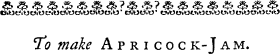 Take Apricocks before the Stones are very hard; wet them, and lay them in a coarse Cloth; put to them two or three large Handfuls of Salt, rub them ’till the Roughness is off, then put them in scalding Water; set them over the Fire ’till they almost boil, then set them off the Fire ’till they are almost cold; do so two or three Times; after this, let them be close cover’d; and when they look to be green, let them boil ’till they begin to be tender; weigh them, and make a Syrup of their Weight in Sugar, to a Pound of Sugar allowing half a Pint of Water to make the Syrup; let it be almost cold before you put in the Apricocks; boil them up well ’till they are clear; warm the Syrup daily, ’till it is pretty thick. You may put them in a Codling-Jelly, 3 B2 or Hartshorn Jelly, or dry them as you use them.