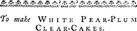 Take a good Quantity of white Pear-Plums, as many as you think will make three Pints, with as much boiling Water as will cover them; boil them very fast, ’till they are all to Pieces; then have ready three Pints of Apple-Jelly, and put it to the Plums, boiling them very fast together; 32 then run it thro’ a Jelly-bag: To a Pint put a Pound and half of sifted Sugar; first boil the Jelly, and shake in the Sugar; let it scald on the Fire ’till it is melted; put it in Pots in the Stove; dry and turn it as other Clear-Cakes.