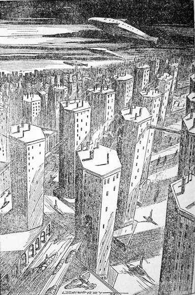 Costigan sprang to his feet, but before he could launch his intended attack a vast tunnel appeared beside him--an annihilating ray had swept through the entire width of the liner, cutting instantly a smooth cylinder of emptiness. Air rushed in to fill the vacuum, and the three visitors felt themselves seized by invisible forces and drawn into the tunnel. Through it they floated, up to and over the buildings, finally slanting downward toward the door of a great high-powered structure. Doors opened before them and closed behind them, until at last they stood upright in a room which was evidently the office of a busy executive. They faced a desk which, in addition to the usual equipment of the business man, carried a bewilderingly complete switchboard and instrument panel.