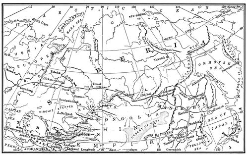 Why "All the Russias"? Look at the map of Eurasia, the continent embracing the two Grand Divisions Europe and Asia. You will see that the Russian Empire is bounded on the north by the Arctic Ocean; on the east by the Bering Strait, the Bering Sea, the Sea of Okhotsk, and the Japan Sea; on the south by China, Pamir, Afghanistan, Persia, Asiatic Turkey, and the Black Sea; and on the west by Roumania, Austria-Hungary, the German Empire, the Baltic Sea, Sweden, and Norway. This immense empire is the growth of many centuries, and even in Europe it has not yet been welded into one whole. When we read Russian books, we learn about Great and Little Russia, White and Red Russia, which shows that divisions of bygone years are still observed by the people. Much has been done towards effacing those boundary lines; but the fact that the czar, autocrat though he is, recognizes and admits the division in his title, shows that even he is, to some extent, subject to public opinion.