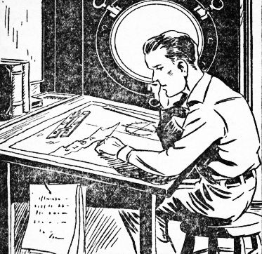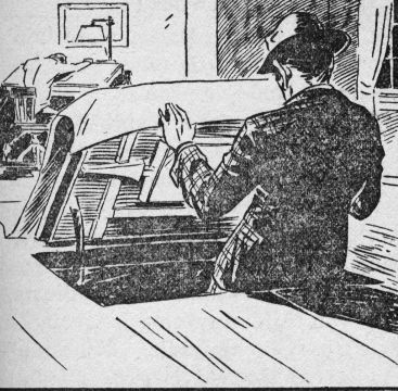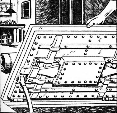 He rolled back a small rug in the middle of the floor to expose a massive steel trap door. This he unlocked by twirling the dial of a complicated mechanism. Some years before Tom had constructed beneath his laboratory an impregnable chamber to safeguard his secret plans. He called it his Chest of Secrets, and guarded it well.