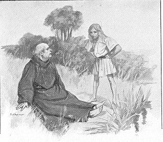 The little monk sighed again and then started off to follow the boys, trying hard to walk slowly and steadily; but it was all in vain. The hill-side sloped very steeply to the broad bed of willows and reeds far below, making the way very bad for so heavy and inactive a man. Worse still: walking over the short grass in the hot sun had made the bottoms of the monk’s sandals as slippery as glass, and so it was that before he had gone far down the slope he began to talk to himself, at first slowly—then quickly—then in a loud excited way—and lastly he uttered a shout and a cry for help.