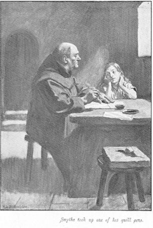 The boy eagerly took hold of the monk’s hand, and they were soon seated at the little table in Swythe’s room, with the light shining full upon the slate slab, the pebble grinder, and the black patch.
