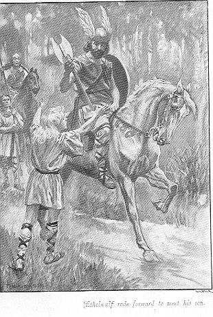 Alfred’s cry was answered by a shout from the men, and Ethelwulf rode forward to meet his son, who grasped his extended hands and sprang up to sit in front of him upon the horse.
