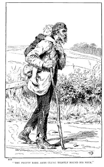 “Hold on,” he said; and the next minute the pretty bare arms were clinging tightly round his neck, the hands hidden in the man’s grizzly tangled beard; and, pig-a-back fashion, he bore him on along the road.