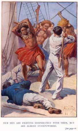 We keep ahead of the enemy, and gain the ship’s side. The falls are ready,—we hook on,—the boats are hoisted up, and we hasten to man the guns. There is a favourable breeze out of the harbour, the anchor is being hove up, the sails are loosed. The canoes gather round us; the savages begin to assail us with all their weapons, shouting and shrieking terribly. The ship gathers way; the savages, grown bold, are climbing up the sides.