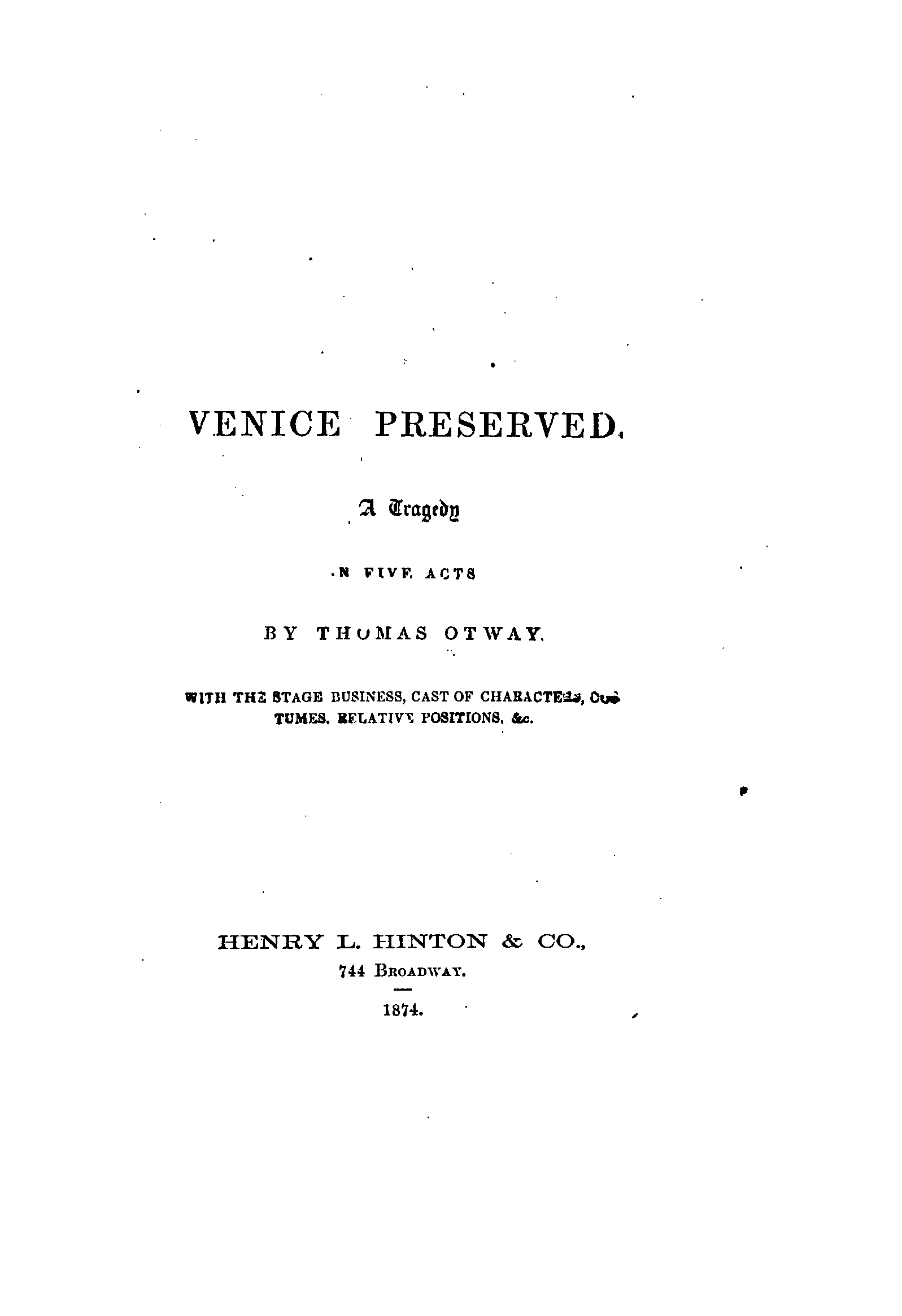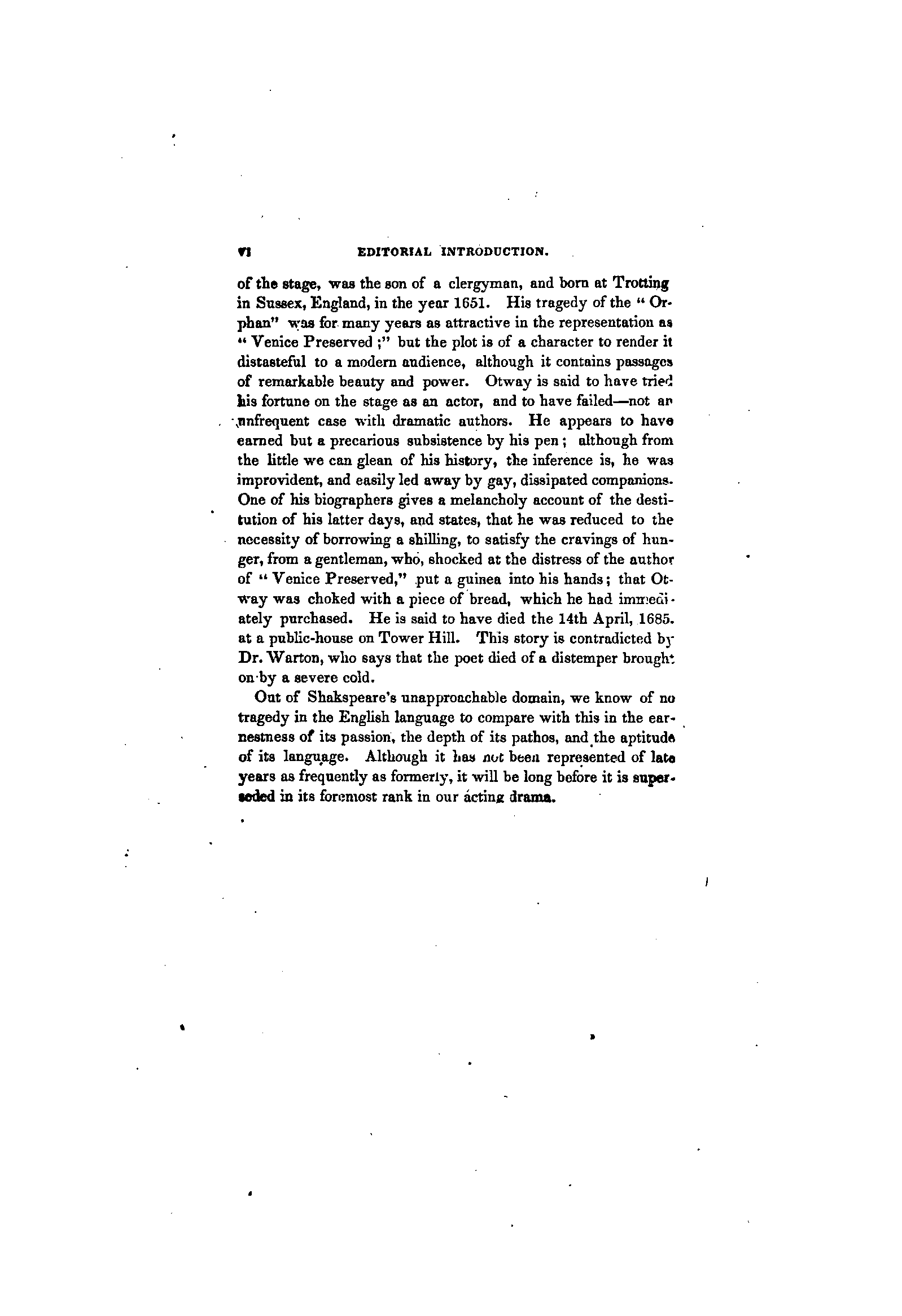 Thomas Otway, the author of this and some nine other plays, of various merit, none of which, however, now keep possession [vi]of the stage, was the son of a clergyman, and born at Trotting in Sussex, England, in the year 1651. His tragedy of the "Orphan" was for many years as attractive in the representation as "Venice Preserved;" but the plot is of a character to render it distasteful to a modern audience, although it contains passages of remarkable beauty and power. Otway is said to have tried his fortune on the stage as an actor, and to have failed—not an infrequent case with dramatic authors. He appears to have earned but a precarious subsistence by his pen; although from the little we can glean of his history, the inference is, he was improvident, and easily led away by gay, dissipated companions. One of his biographers gives a melancholy account of the destitution of his latter days, and states, that he was reduced to the necessity of borrowing a shilling, to satisfy the cravings of hunger, from a gentleman, who, shocked at the distress of the author of "Venice Preserved," put a guinea into his hands; that Otway was choked with a piece of bread, which he had immediately purchased. He is said to have died the 14th April, 1685. at a public-house on Tower Hill. This story is contradicted by Dr. Warton, who says that the poet died of a distemper brought on by a severe cold.