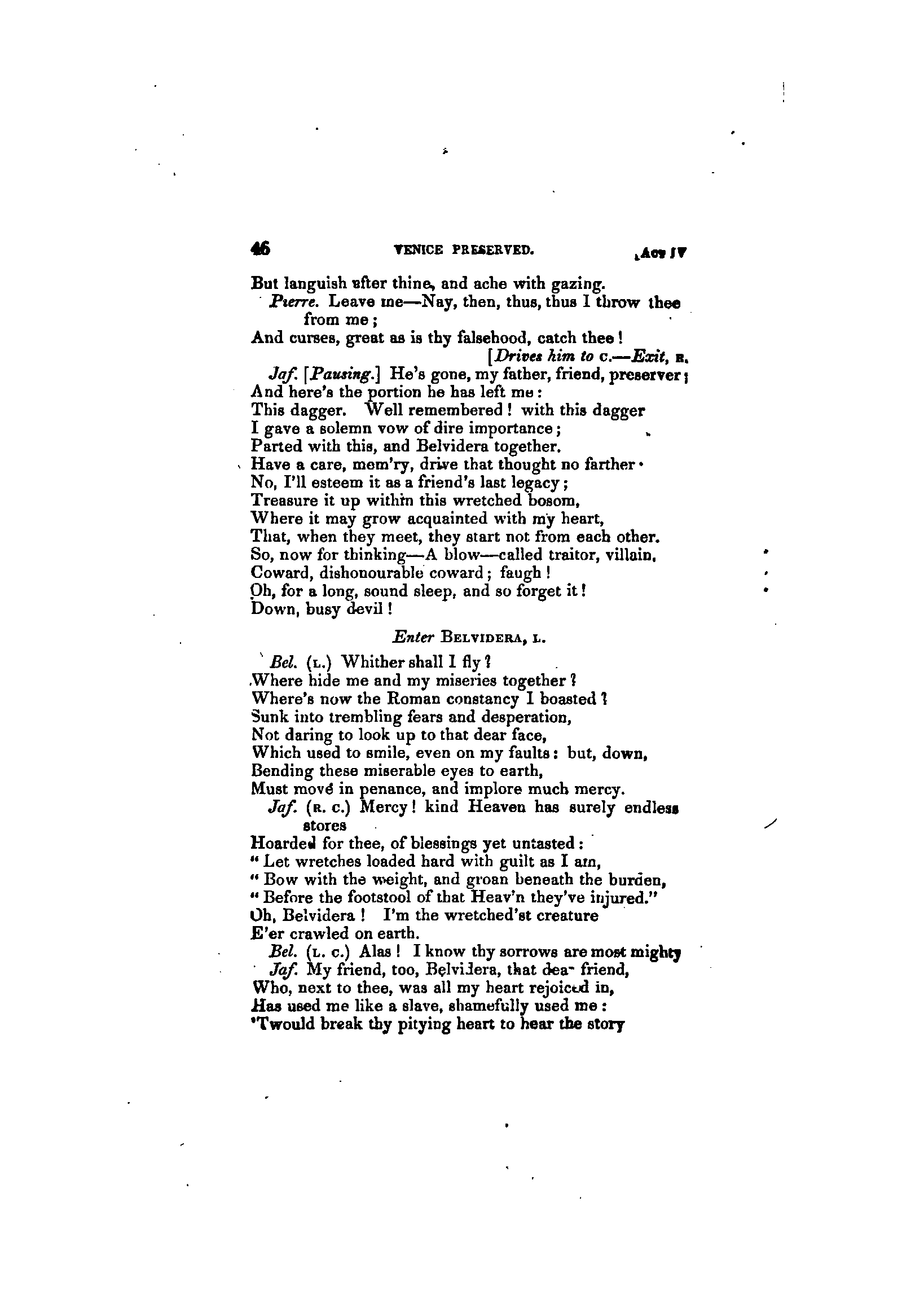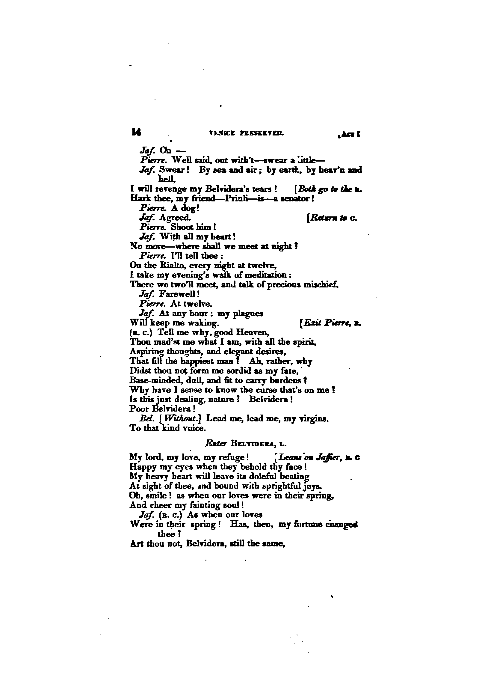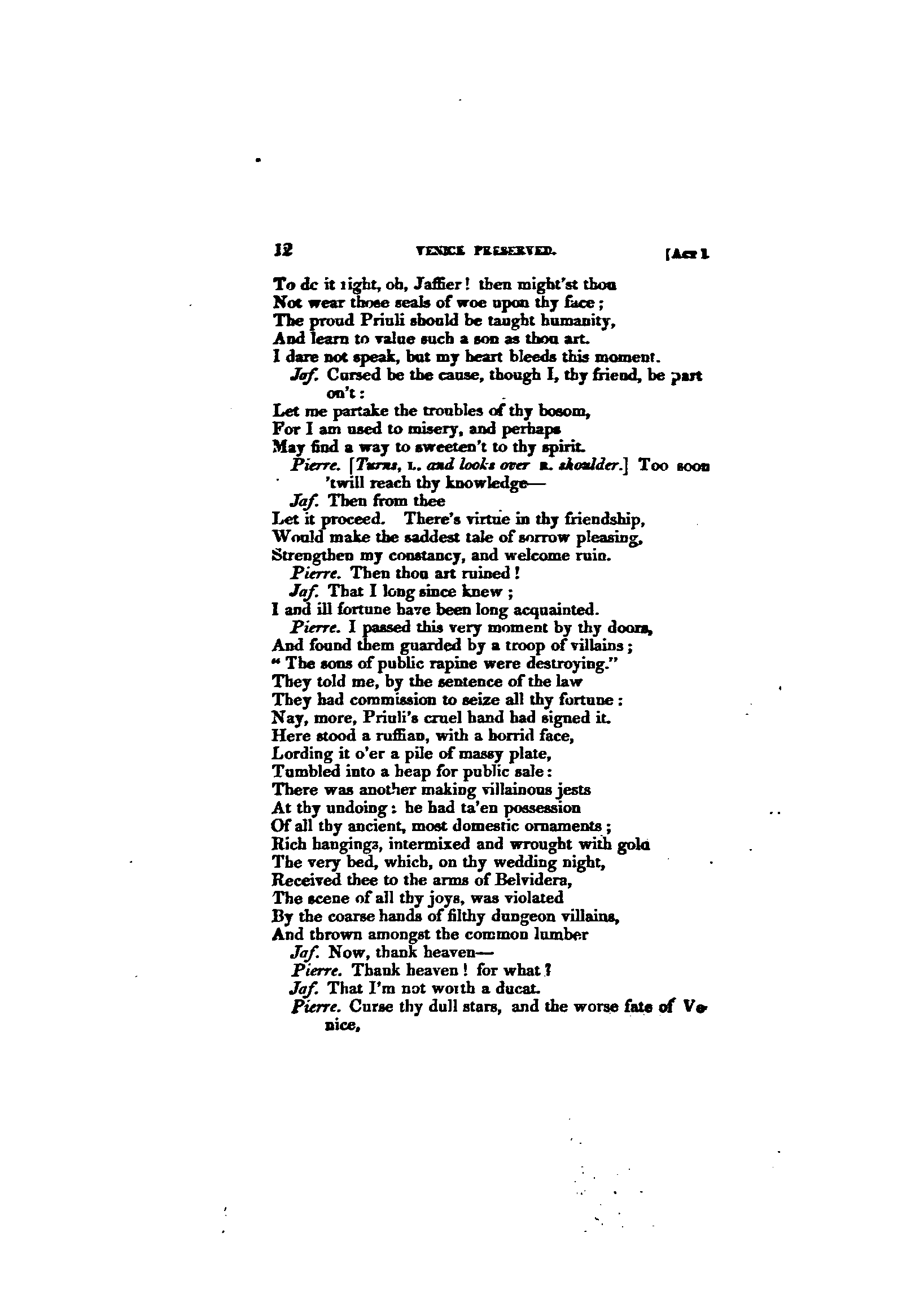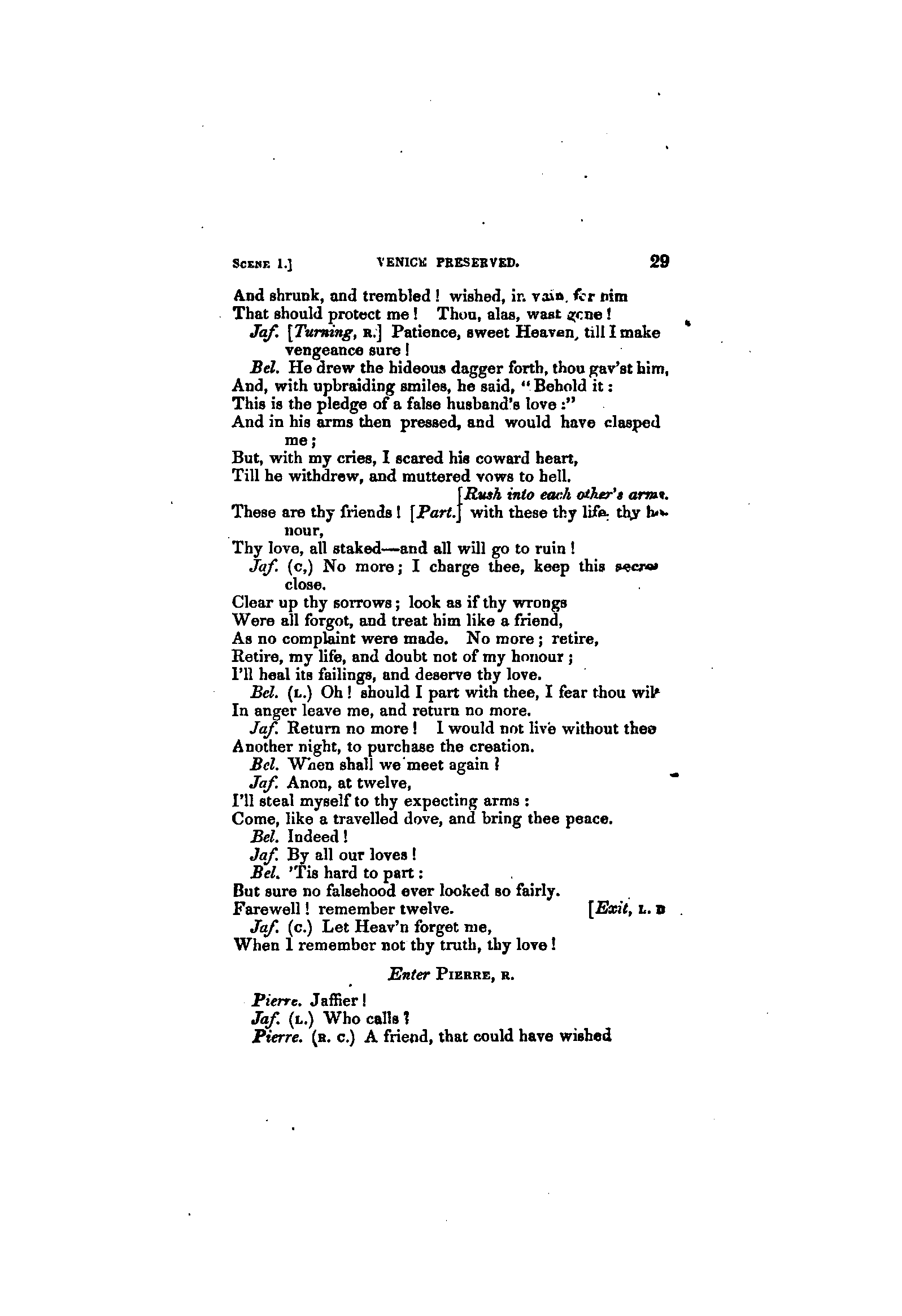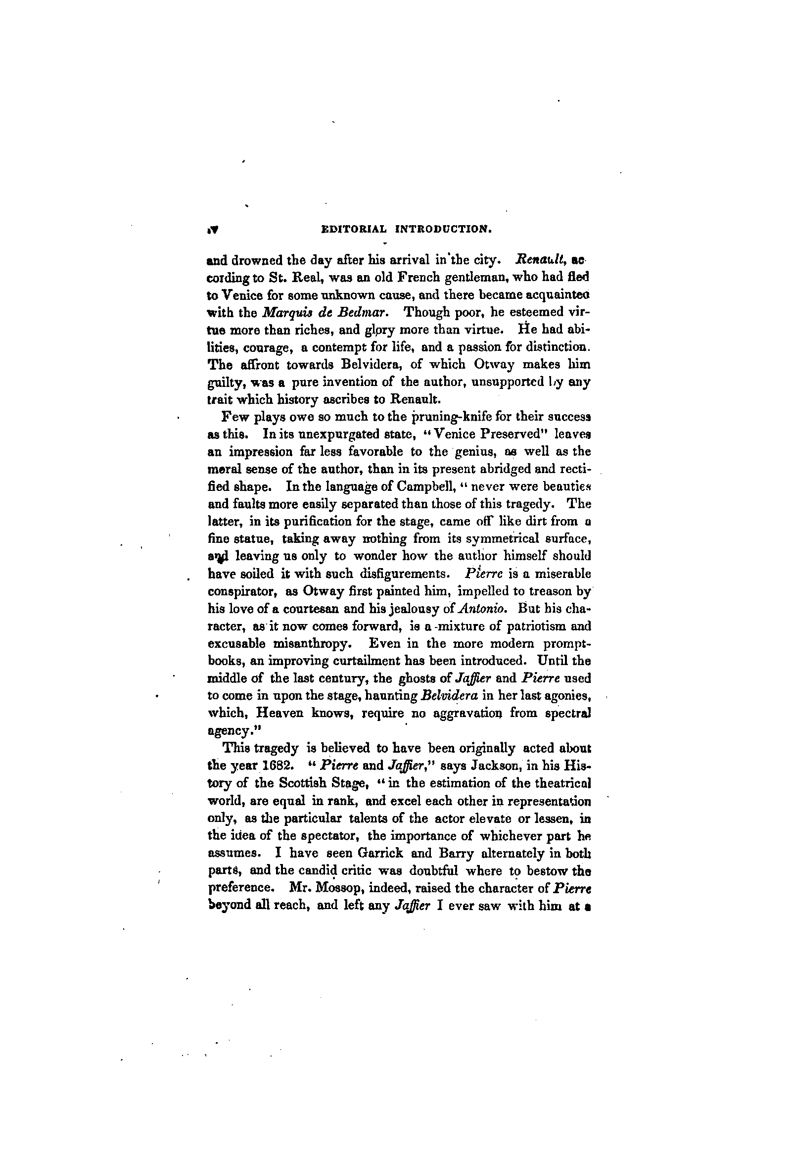 This tragedy is believed to have been originally acted about the year 1682. "Pierre and Jaffier," says Jackson, in his History of the Scottish Stage, "in the estimation of the theatrical world, are equal in rank, and excel each other in representation only, as the particular talents of the actor elevate or lessen, in the idea of the spectator, the importance of whichever part he assumes. I have seen Garrick and Barry alternately in both parts, and the candid critic was doubtful where to bestow the preference. Mr. Mossop, indeed, raised the character of Pierre beyond all reach, and left any Jaffier I ever saw with him at a [v]distance: out, had he attempted Jqffier, I am confident he would with Barry in Pierre, have stood far behind."