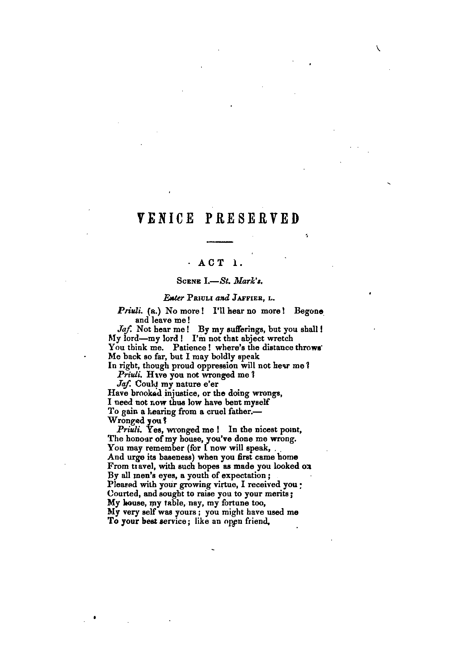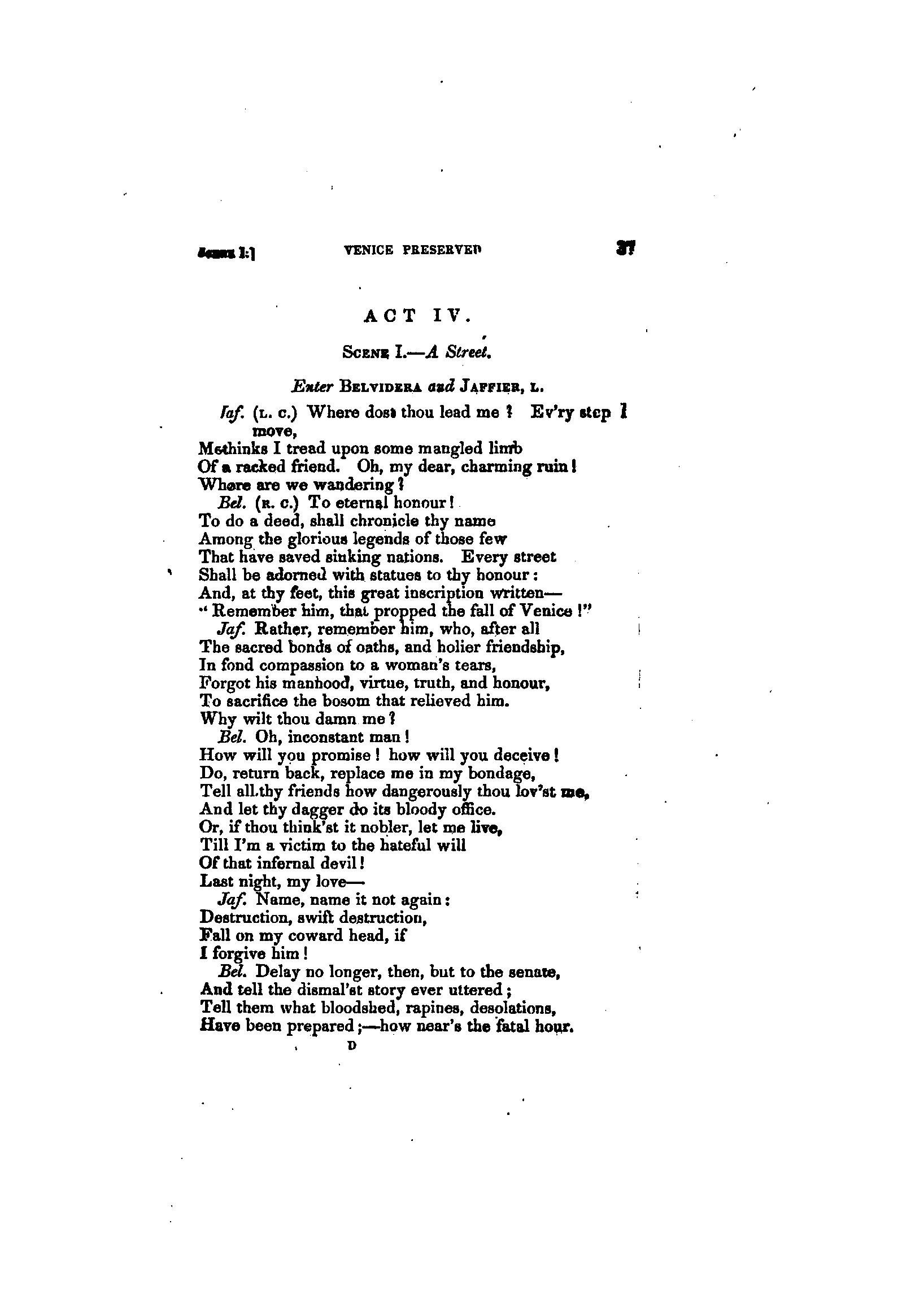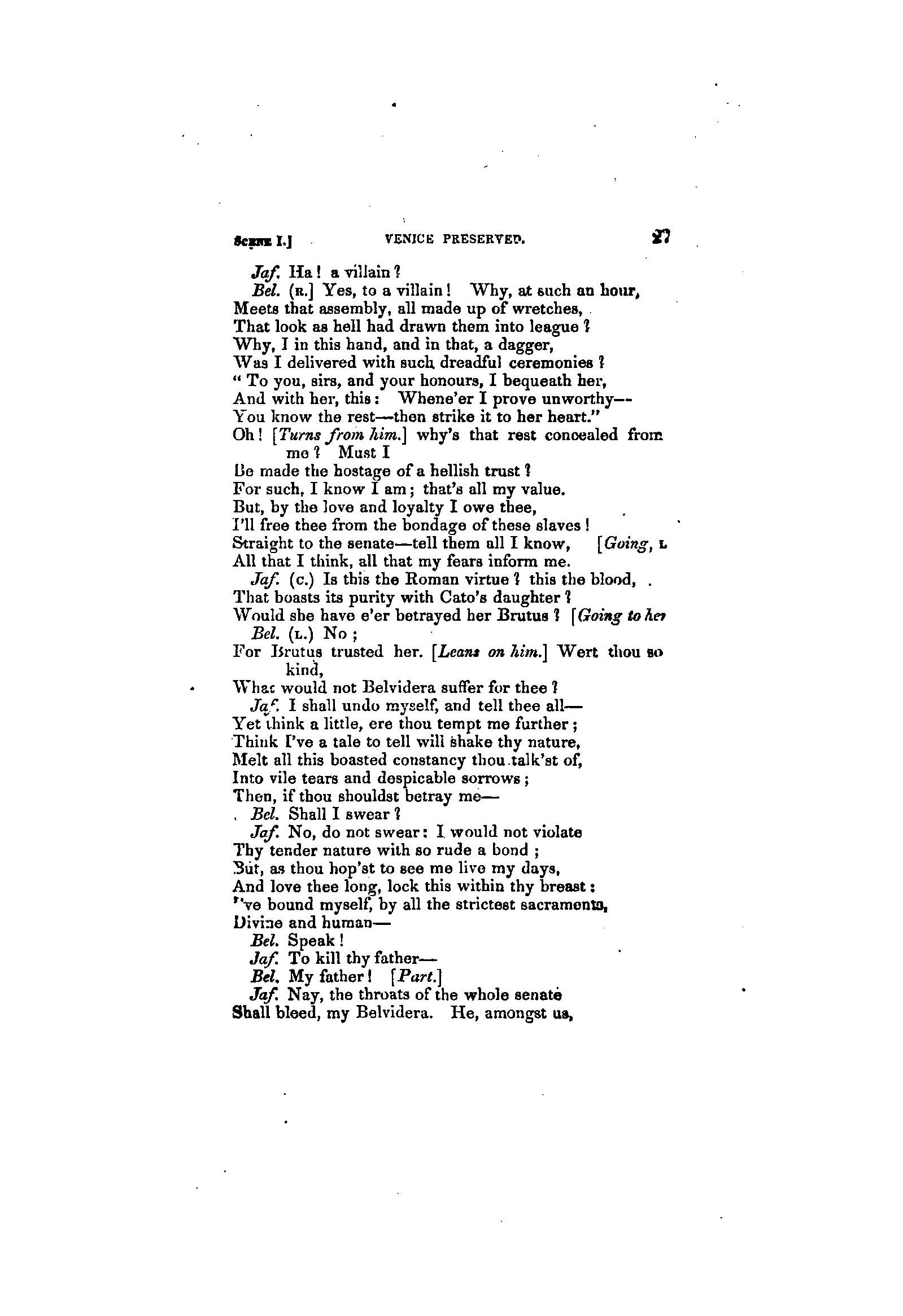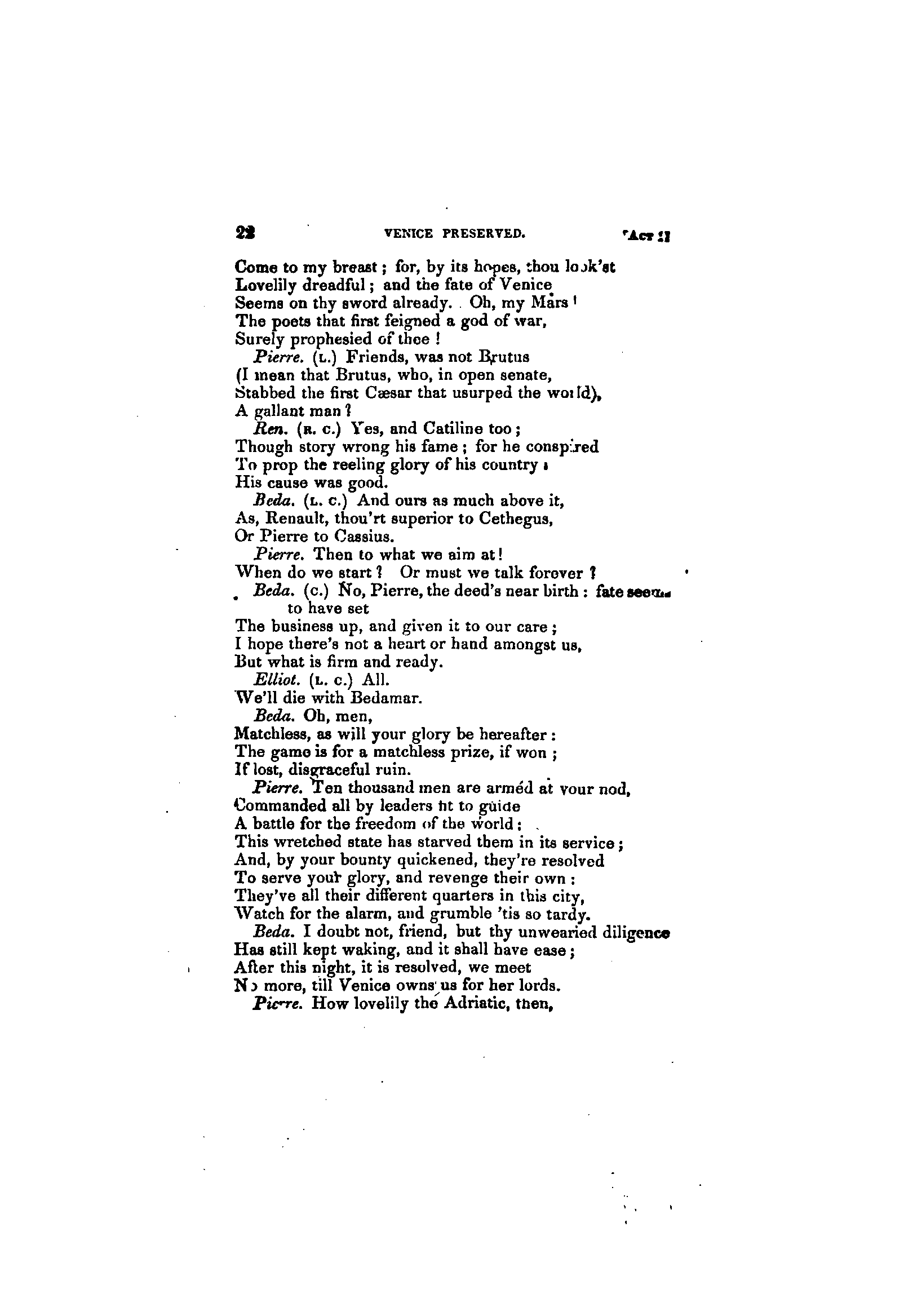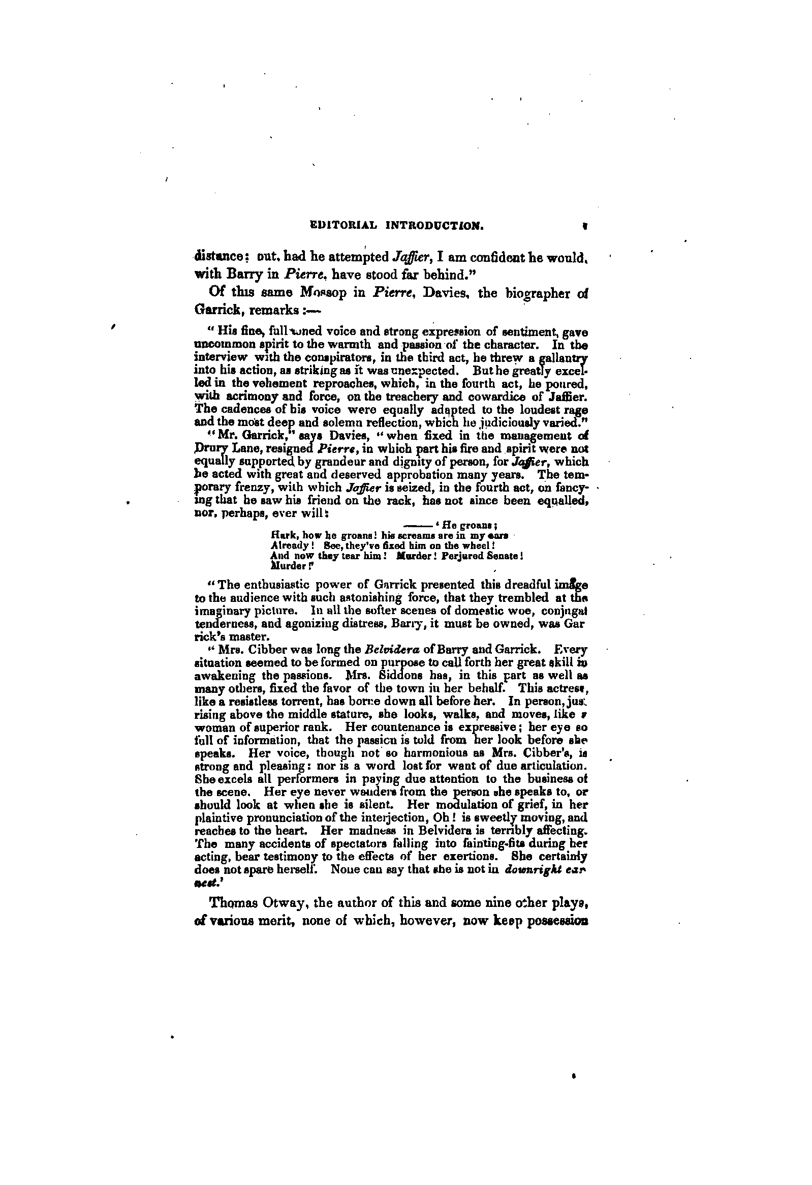 This tragedy is believed to have been originally acted about the year 1682. "Pierre and Jaffier," says Jackson, in his History of the Scottish Stage, "in the estimation of the theatrical world, are equal in rank, and excel each other in representation only, as the particular talents of the actor elevate or lessen, in the idea of the spectator, the importance of whichever part he assumes. I have seen Garrick and Barry alternately in both parts, and the candid critic was doubtful where to bestow the preference. Mr. Mossop, indeed, raised the character of Pierre beyond all reach, and left any Jaffier I ever saw with him at a [v]distance: out, had he attempted Jqffier, I am confident he would with Barry in Pierre, have stood far behind."