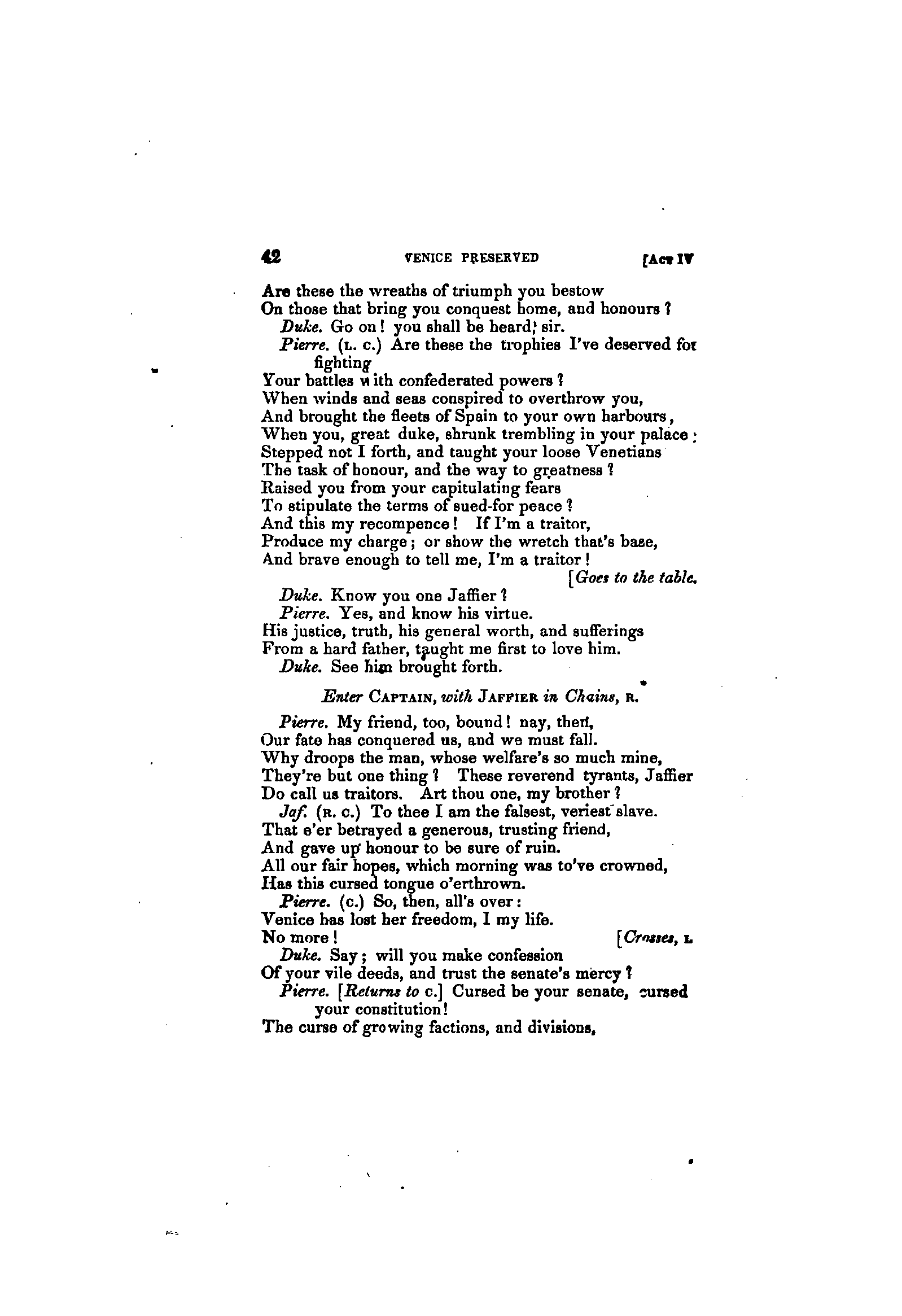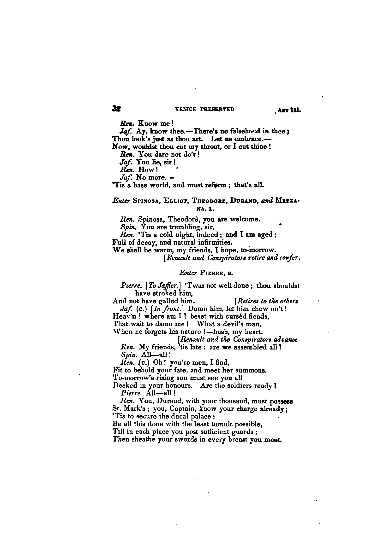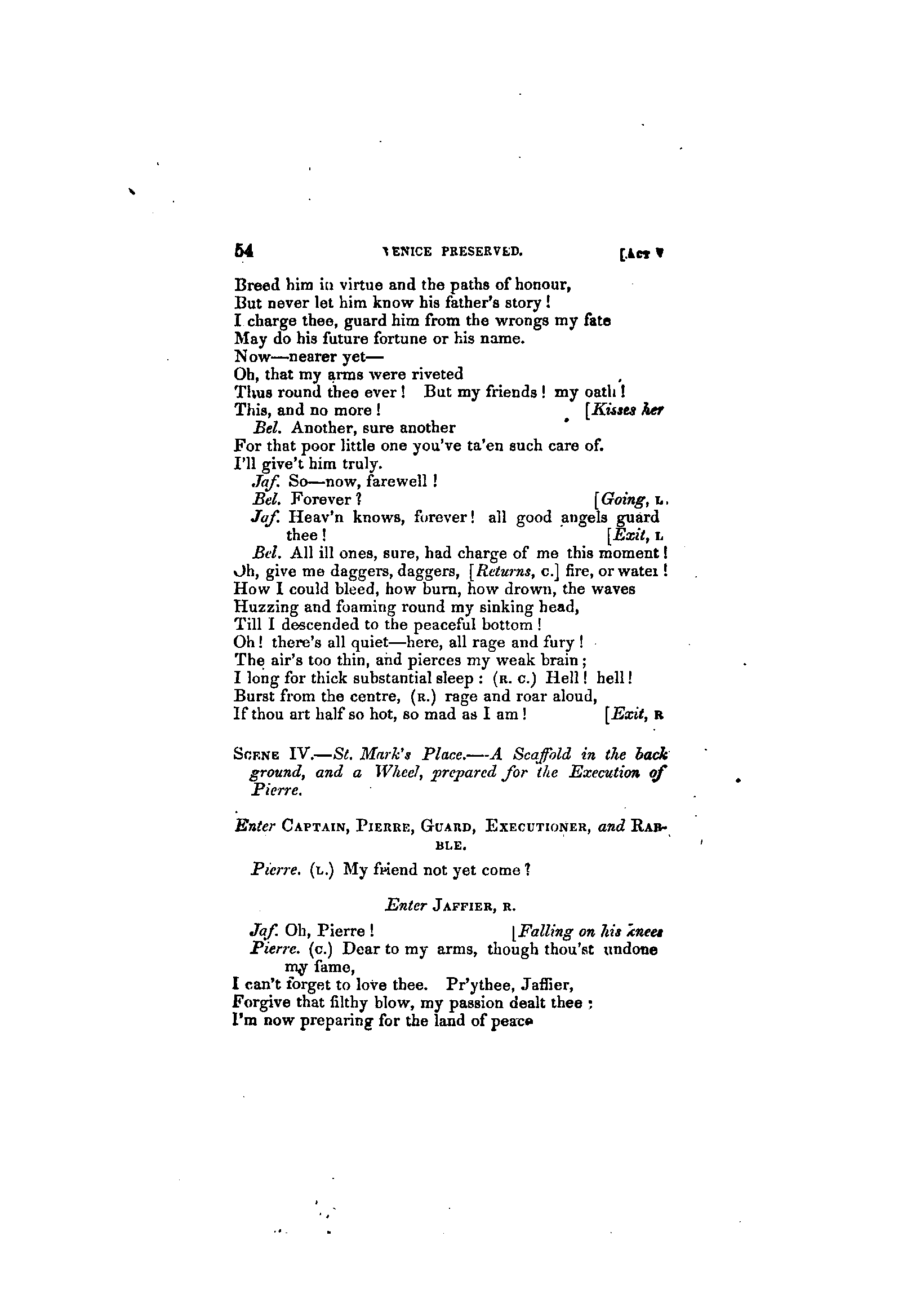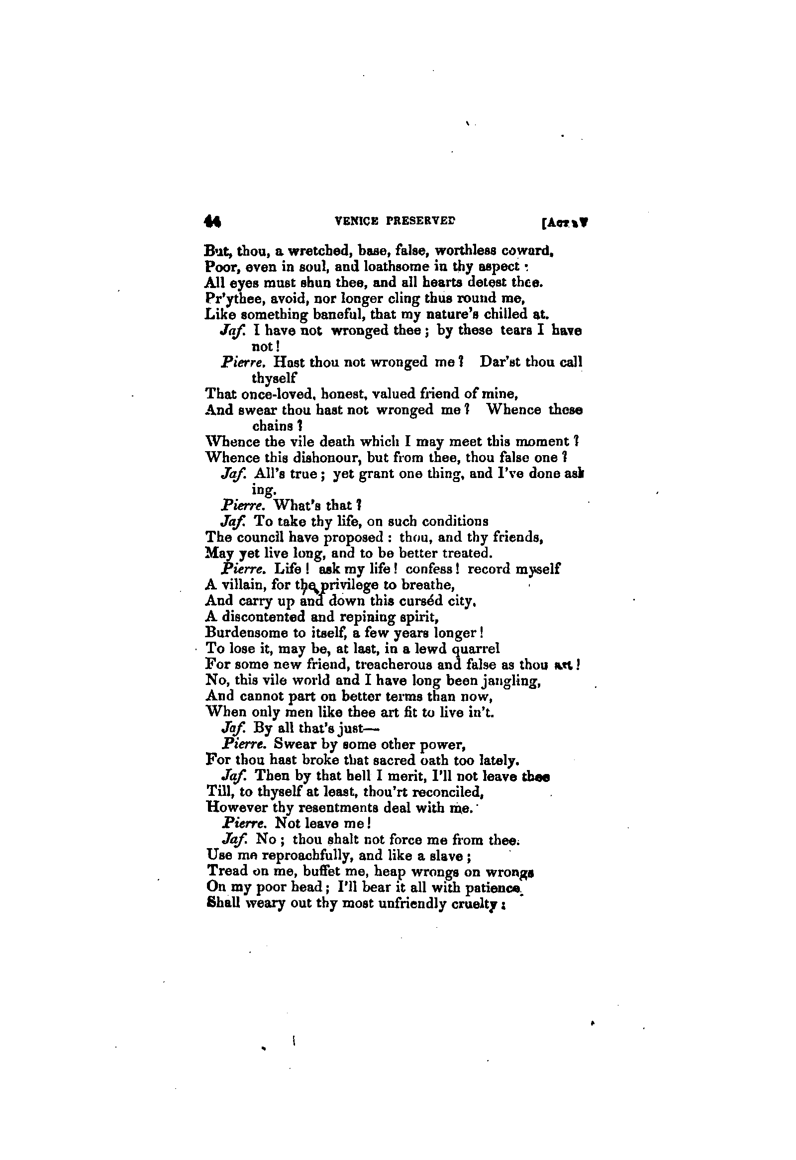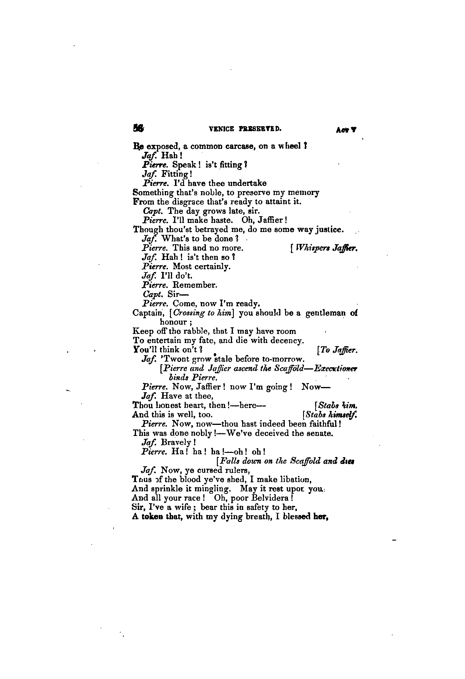 This tragedy is believed to have been originally acted about the year 1682. "Pierre and Jaffier," says Jackson, in his History of the Scottish Stage, "in the estimation of the theatrical world, are equal in rank, and excel each other in representation only, as the particular talents of the actor elevate or lessen, in the idea of the spectator, the importance of whichever part he assumes. I have seen Garrick and Barry alternately in both parts, and the candid critic was doubtful where to bestow the preference. Mr. Mossop, indeed, raised the character of Pierre beyond all reach, and left any Jaffier I ever saw with him at a [v]distance: out, had he attempted Jqffier, I am confident he would with Barry in Pierre, have stood far behind."