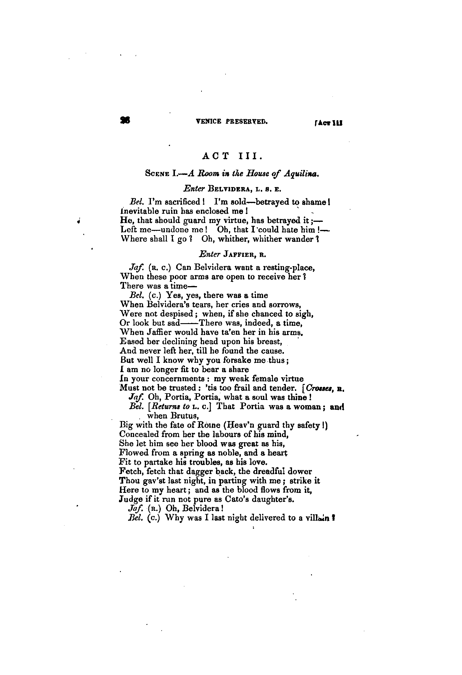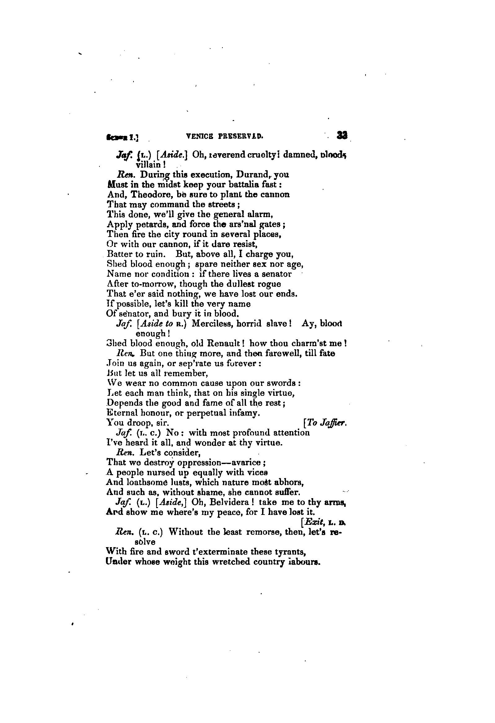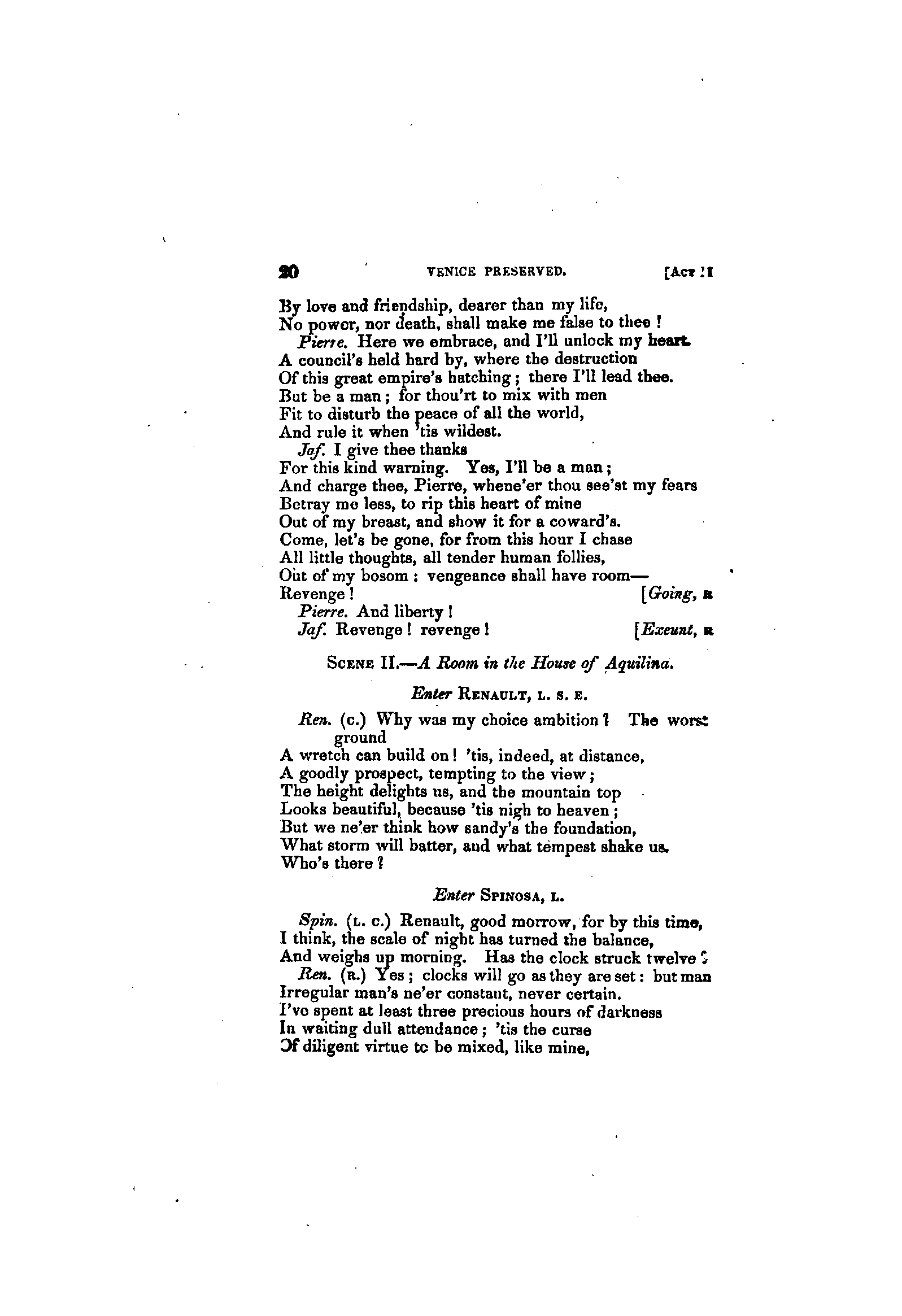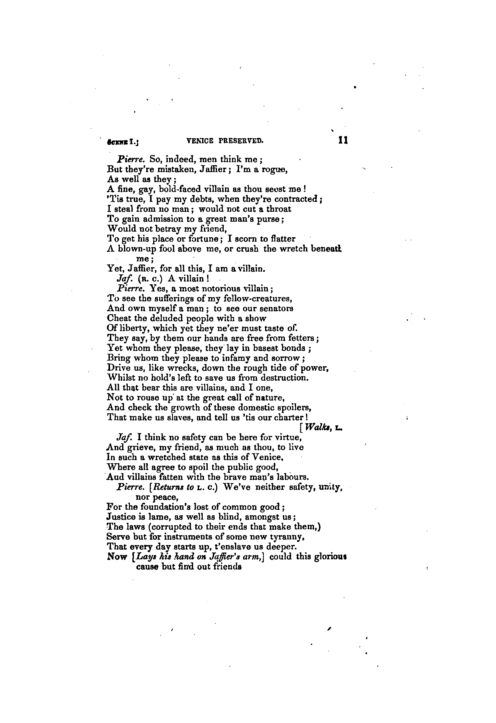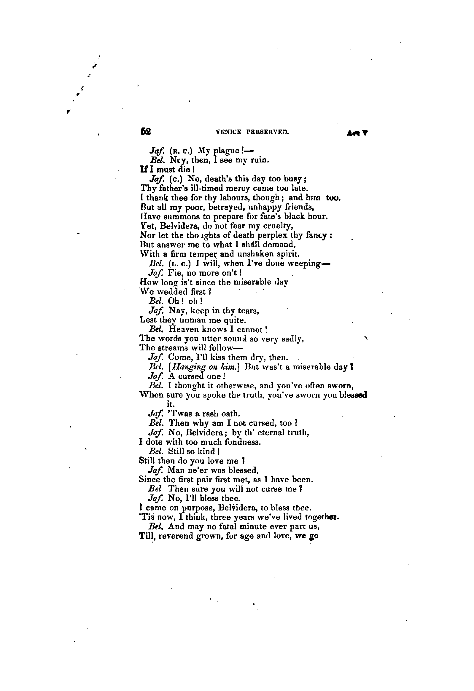 This tragedy is believed to have been originally acted about the year 1682. "Pierre and Jaffier," says Jackson, in his History of the Scottish Stage, "in the estimation of the theatrical world, are equal in rank, and excel each other in representation only, as the particular talents of the actor elevate or lessen, in the idea of the spectator, the importance of whichever part he assumes. I have seen Garrick and Barry alternately in both parts, and the candid critic was doubtful where to bestow the preference. Mr. Mossop, indeed, raised the character of Pierre beyond all reach, and left any Jaffier I ever saw with him at a [v]distance: out, had he attempted Jqffier, I am confident he would with Barry in Pierre, have stood far behind."