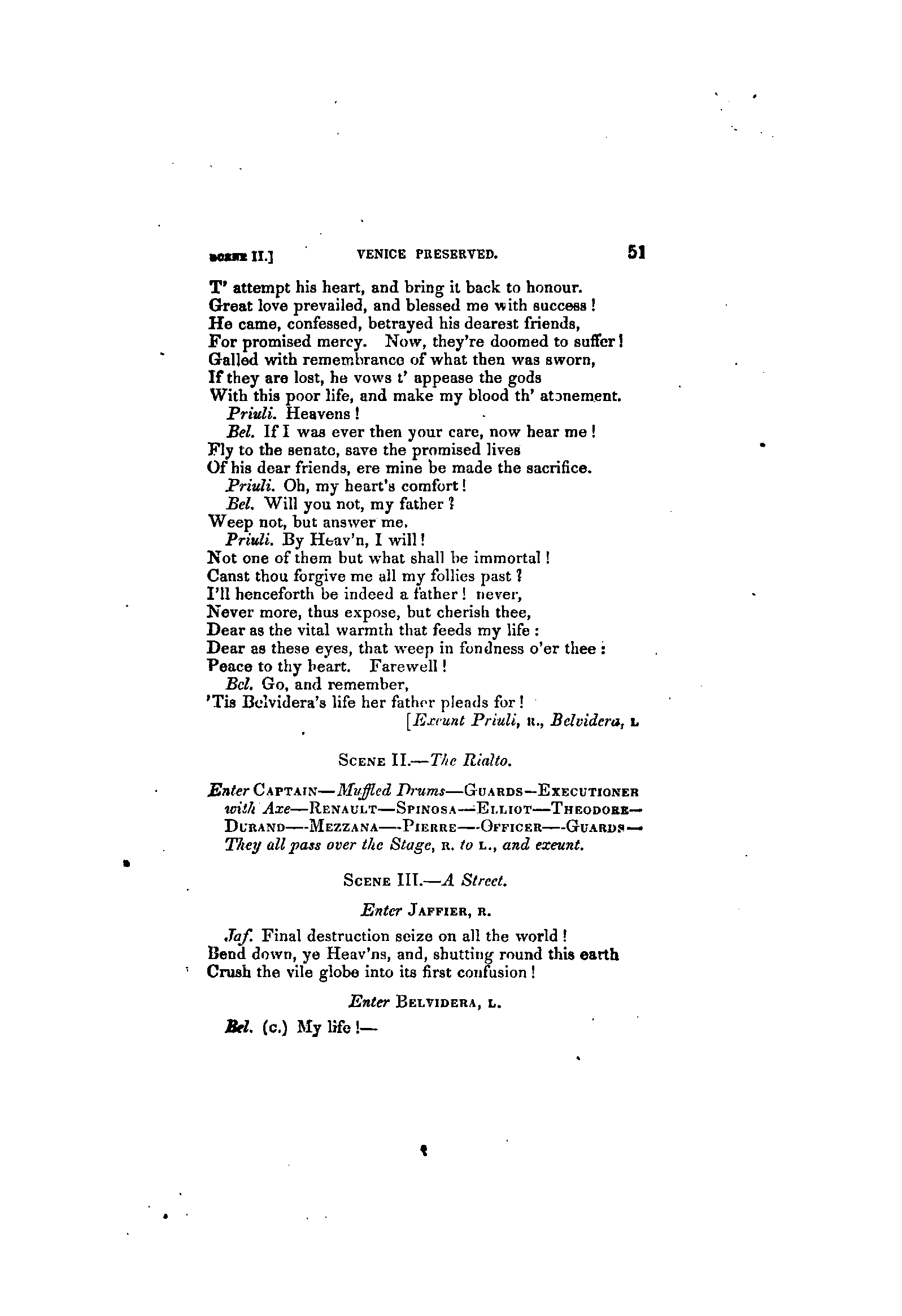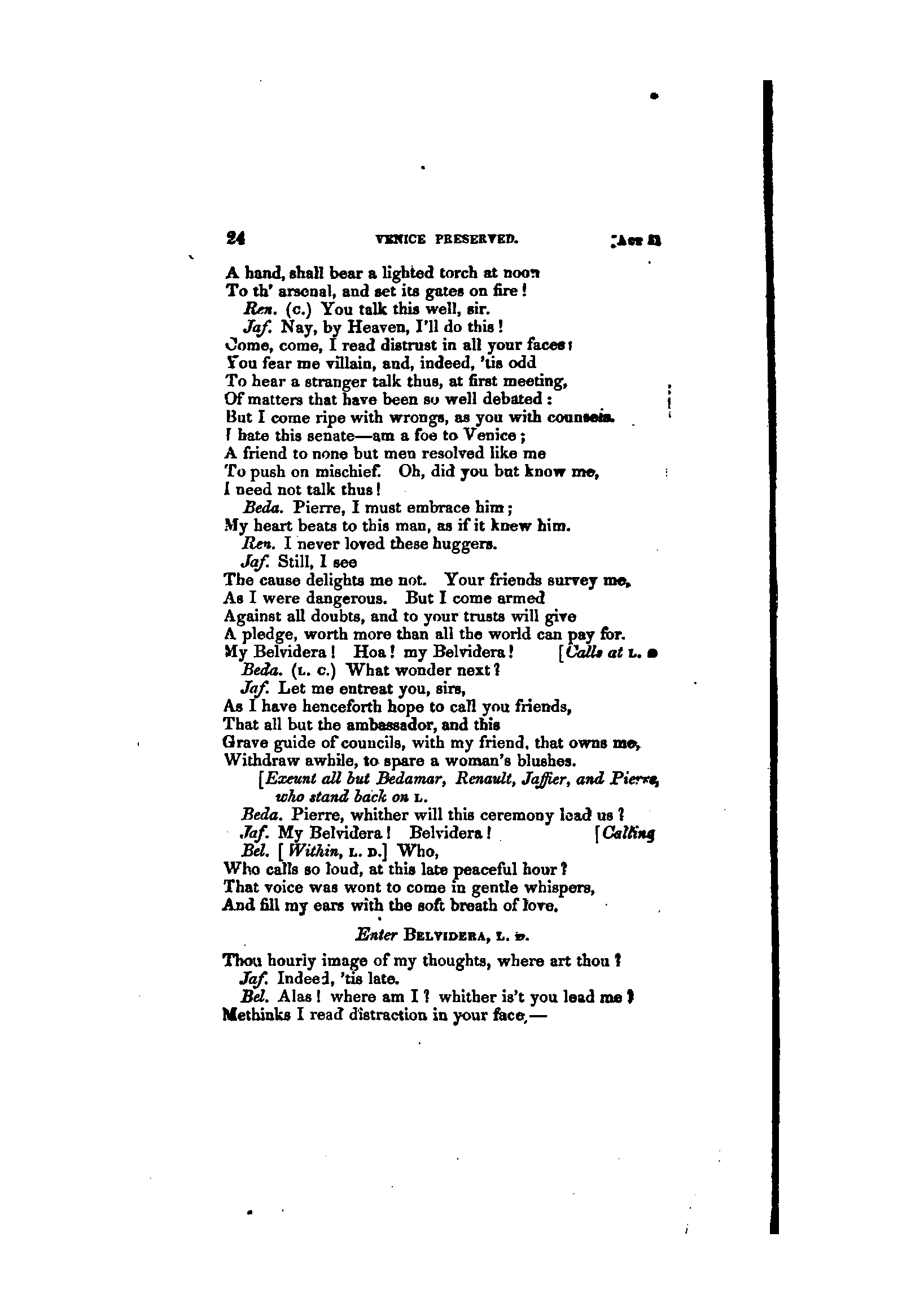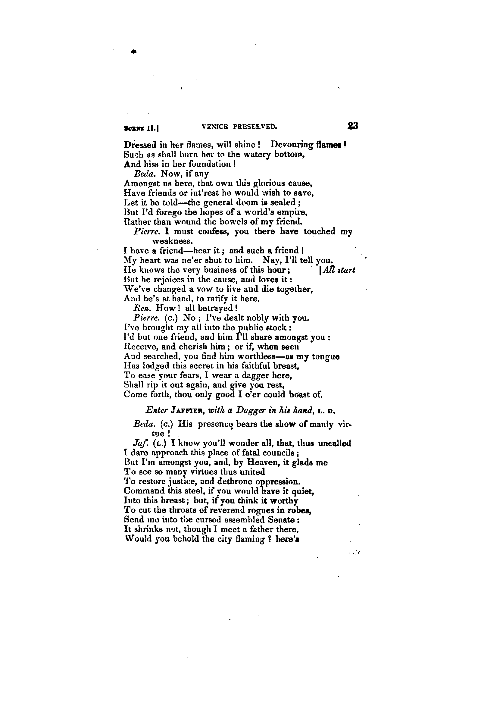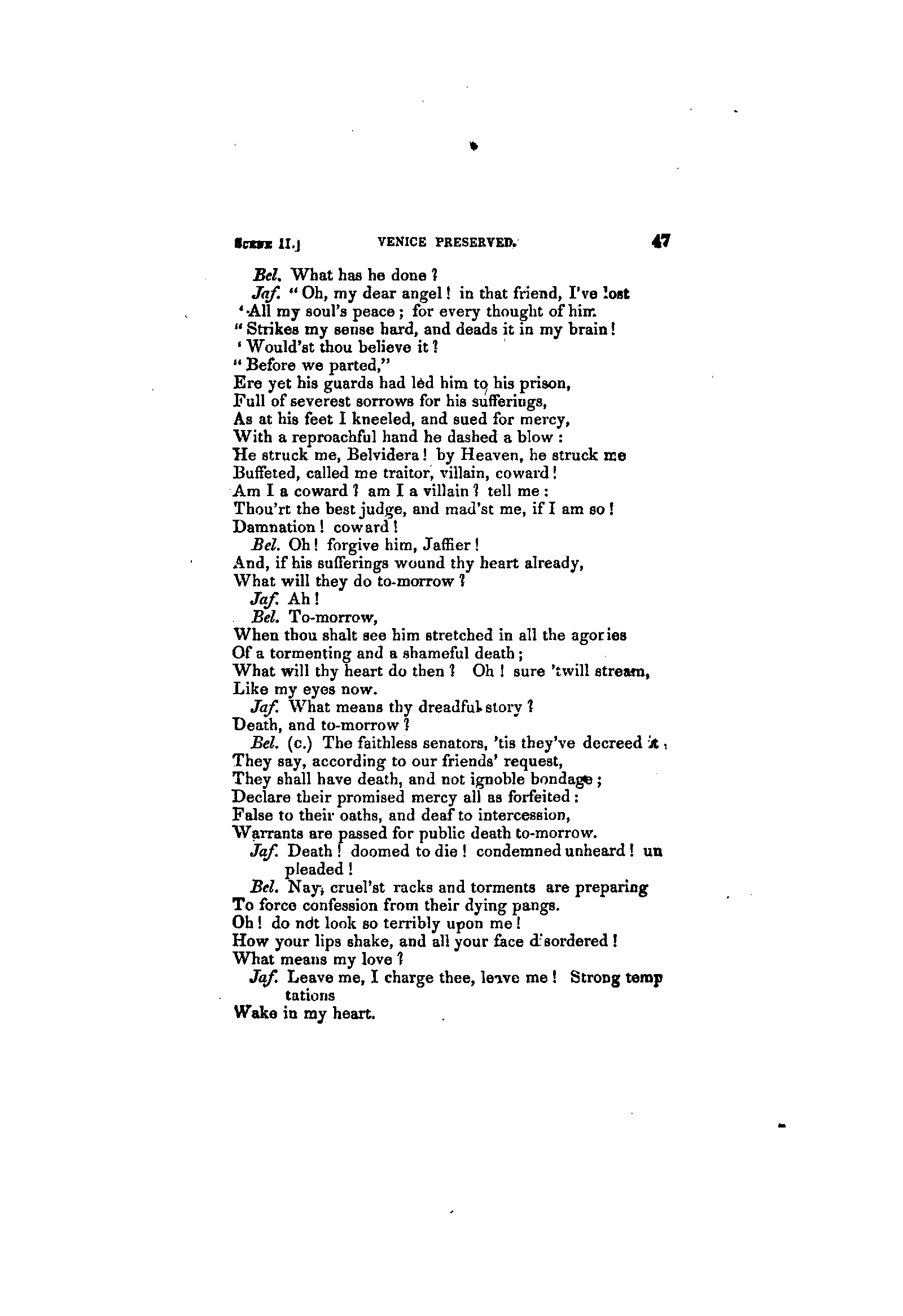 This tragedy is believed to have been originally acted about the year 1682. "Pierre and Jaffier," says Jackson, in his History of the Scottish Stage, "in the estimation of the theatrical world, are equal in rank, and excel each other in representation only, as the particular talents of the actor elevate or lessen, in the idea of the spectator, the importance of whichever part he assumes. I have seen Garrick and Barry alternately in both parts, and the candid critic was doubtful where to bestow the preference. Mr. Mossop, indeed, raised the character of Pierre beyond all reach, and left any Jaffier I ever saw with him at a [v]distance: out, had he attempted Jqffier, I am confident he would with Barry in Pierre, have stood far behind."