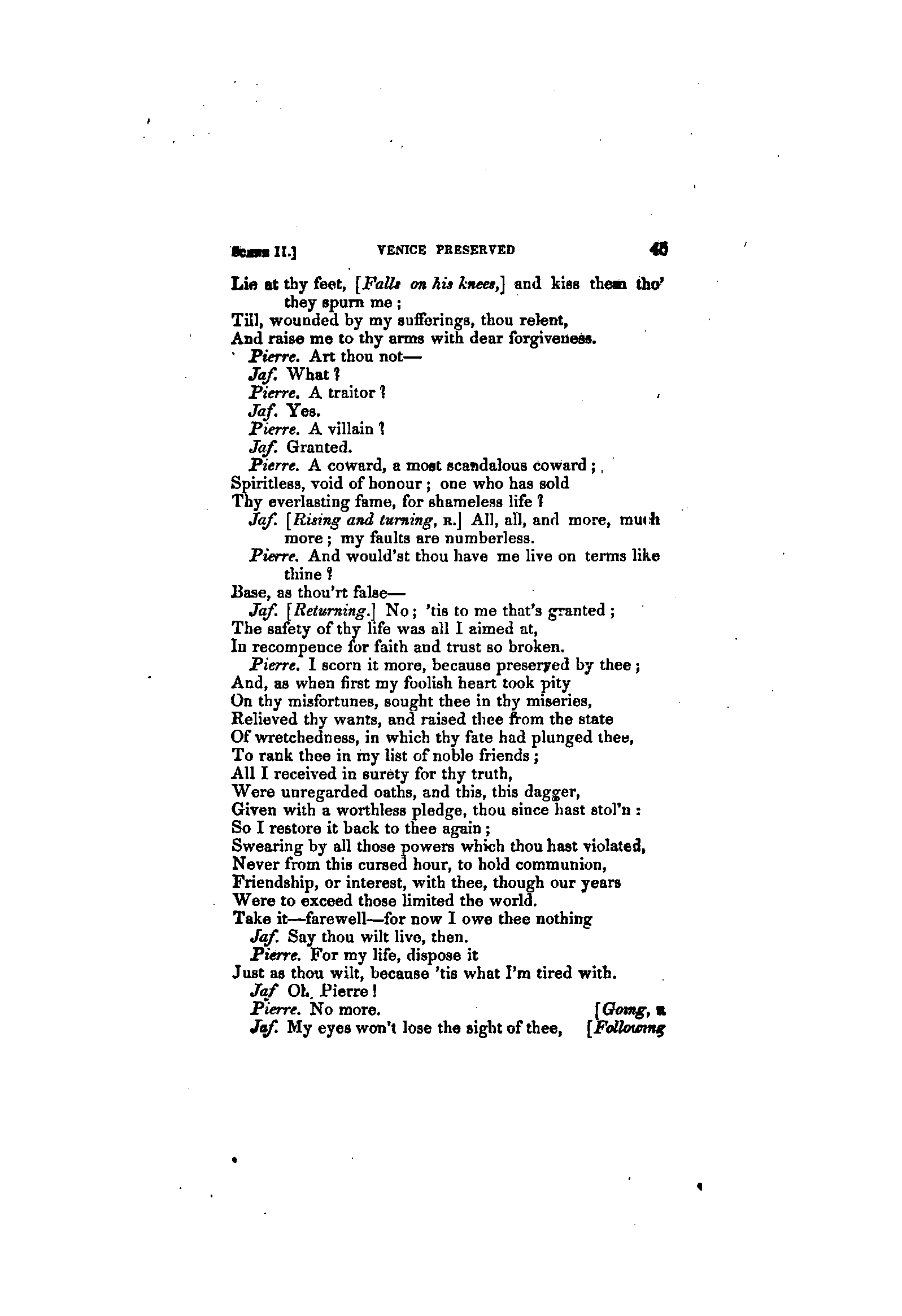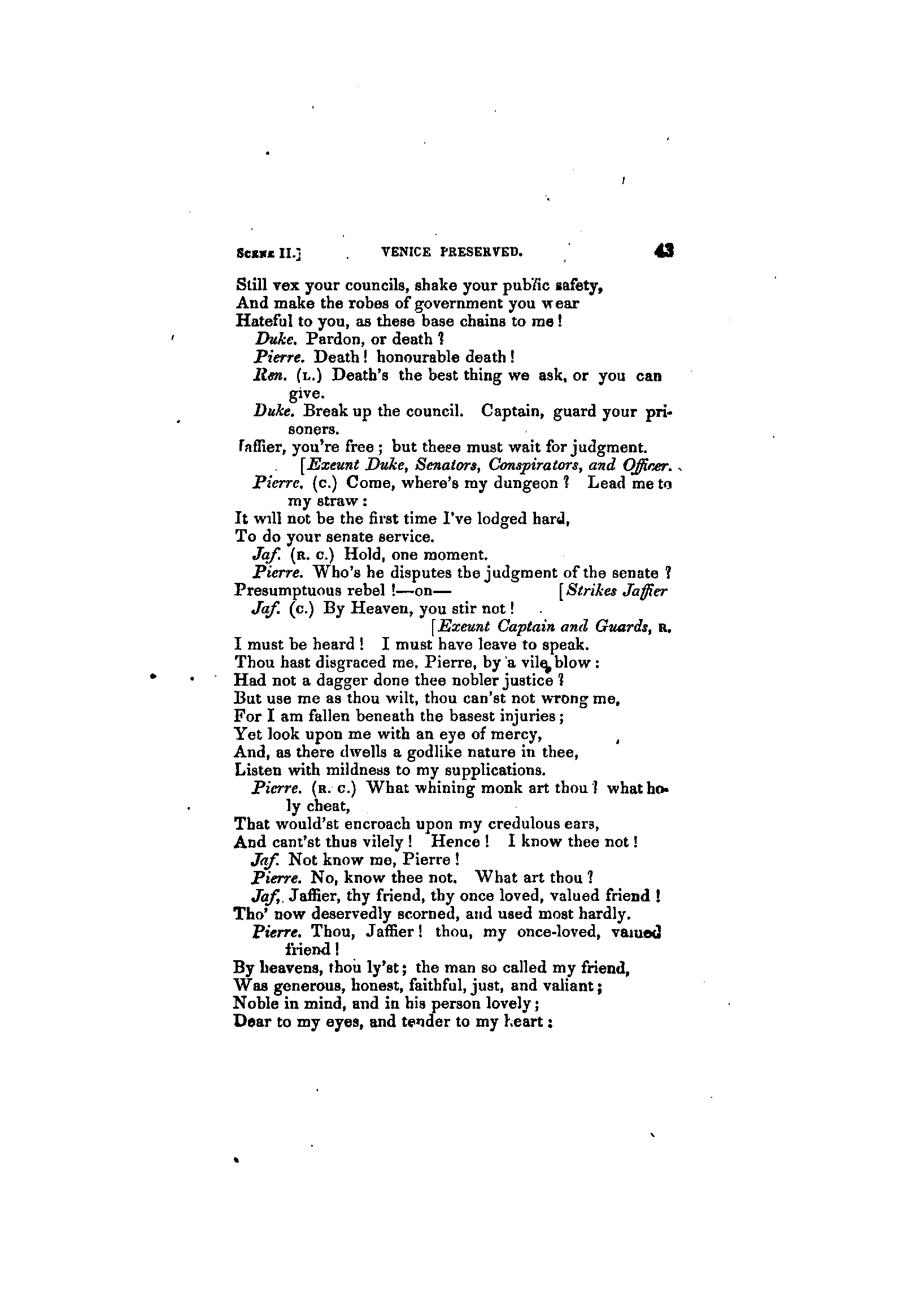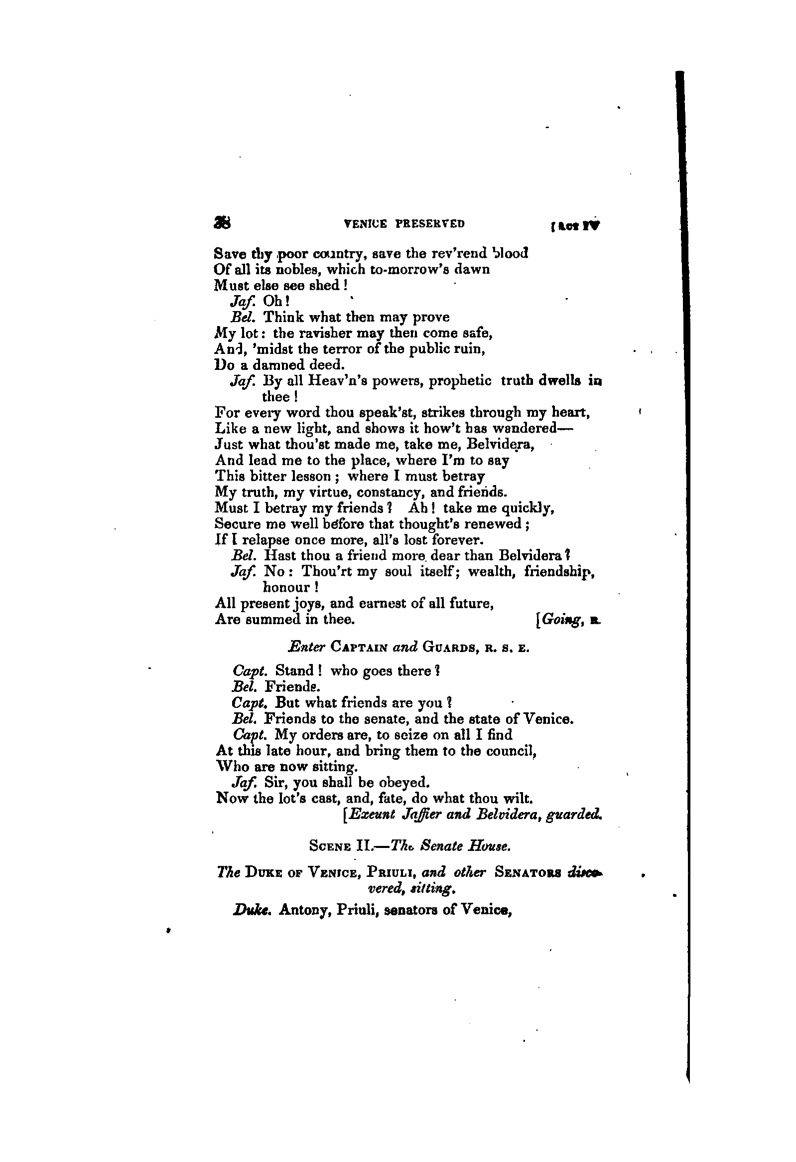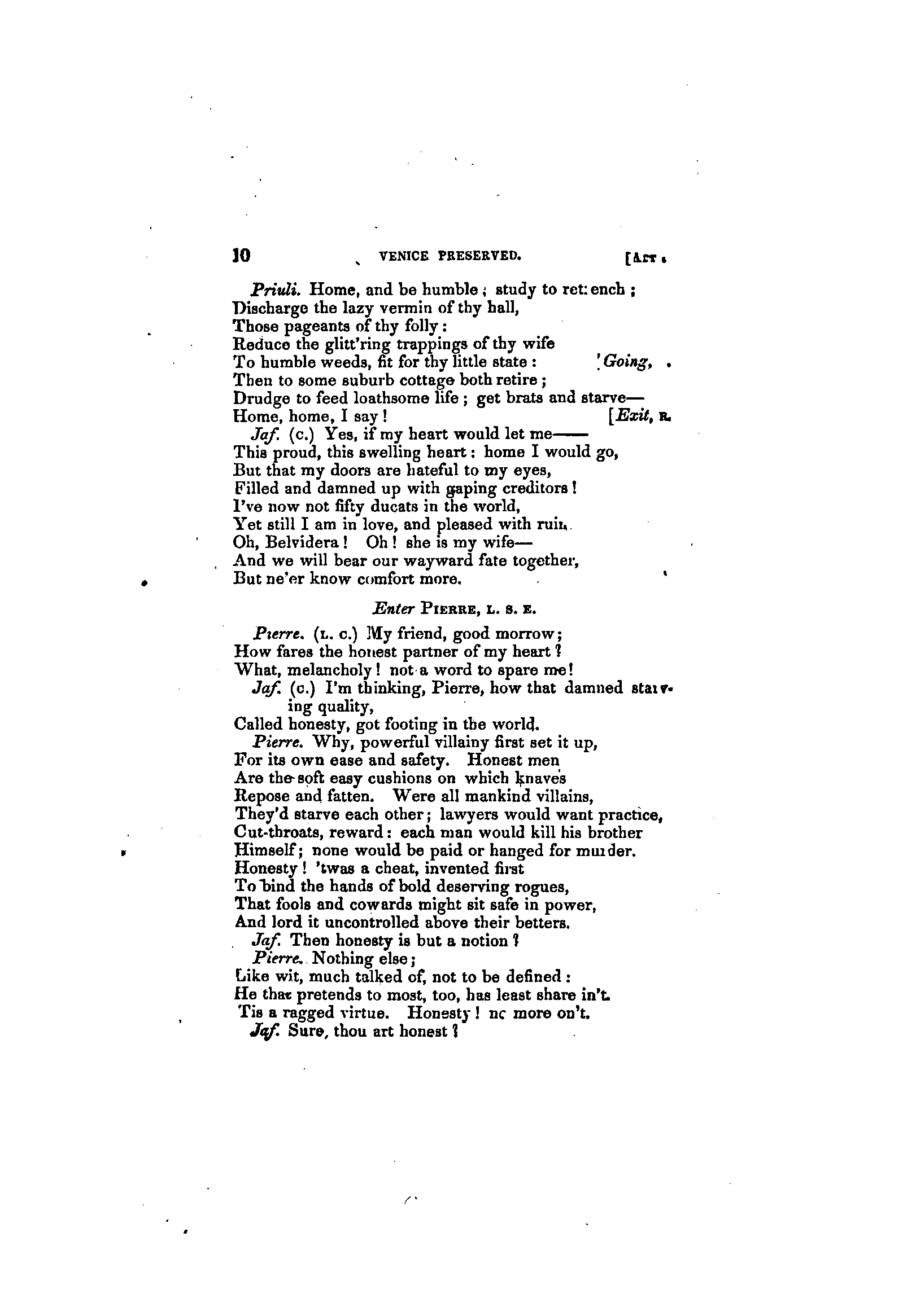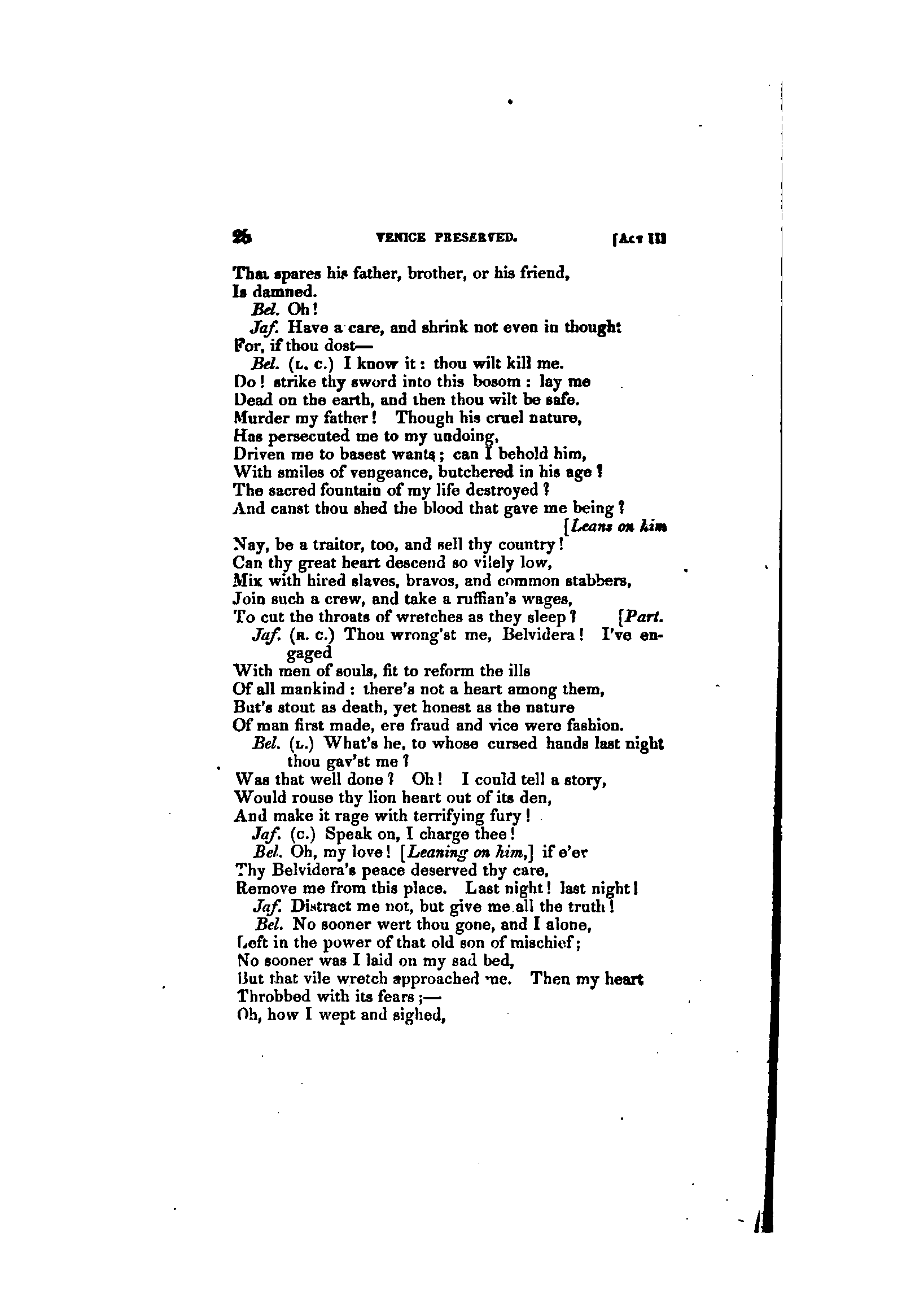 This tragedy is believed to have been originally acted about the year 1682. "Pierre and Jaffier," says Jackson, in his History of the Scottish Stage, "in the estimation of the theatrical world, are equal in rank, and excel each other in representation only, as the particular talents of the actor elevate or lessen, in the idea of the spectator, the importance of whichever part he assumes. I have seen Garrick and Barry alternately in both parts, and the candid critic was doubtful where to bestow the preference. Mr. Mossop, indeed, raised the character of Pierre beyond all reach, and left any Jaffier I ever saw with him at a [v]distance: out, had he attempted Jqffier, I am confident he would with Barry in Pierre, have stood far behind."