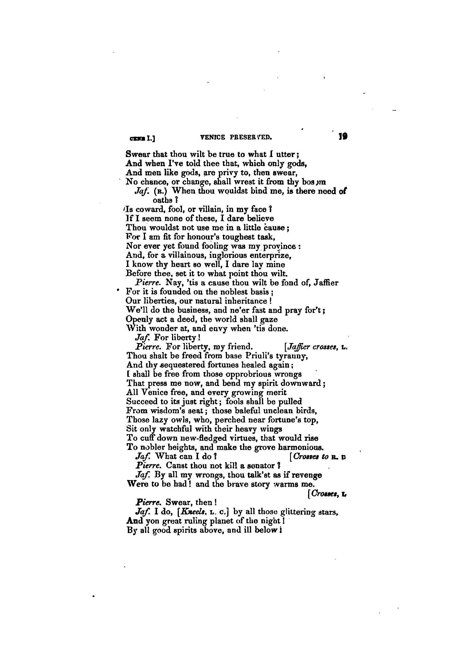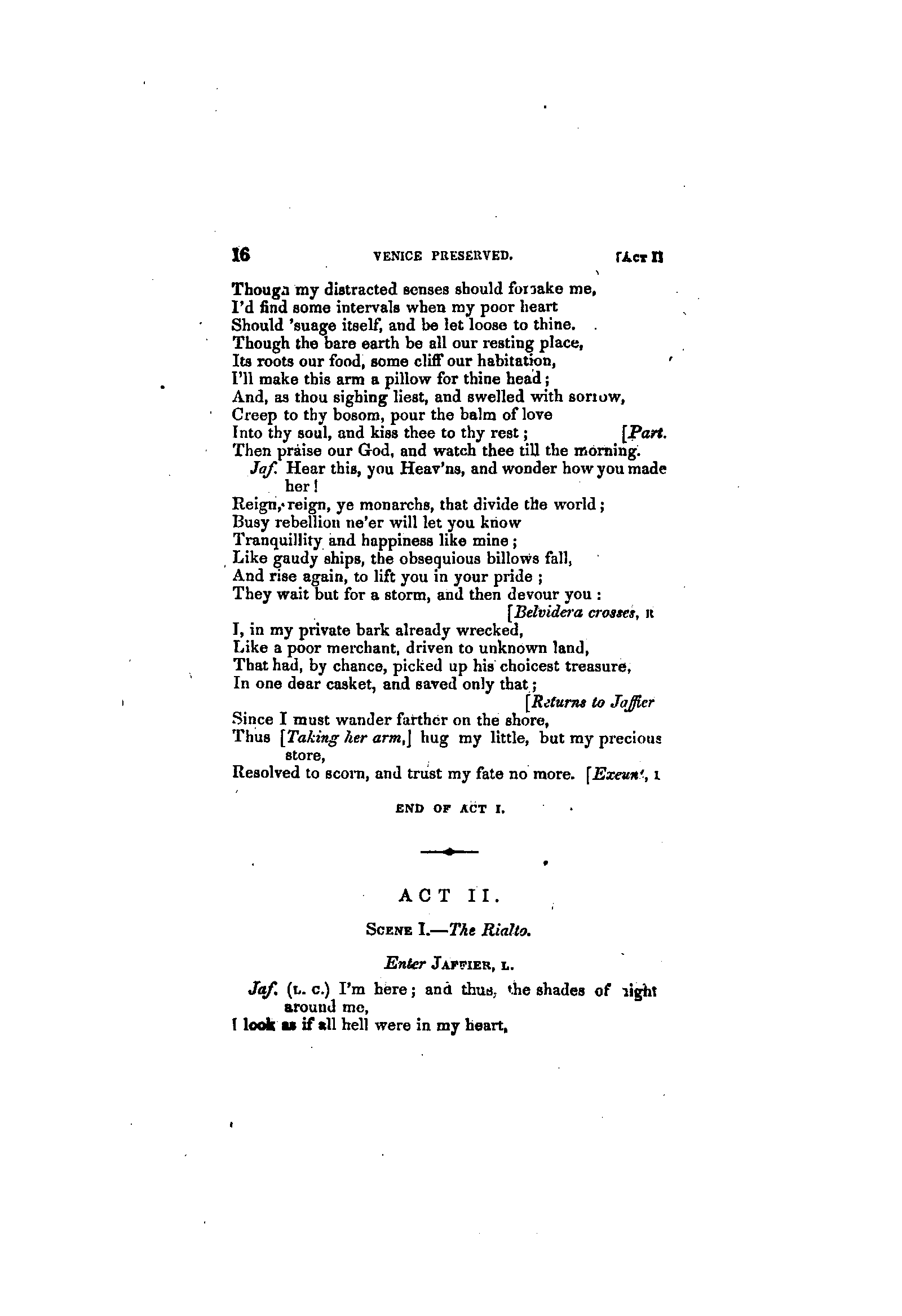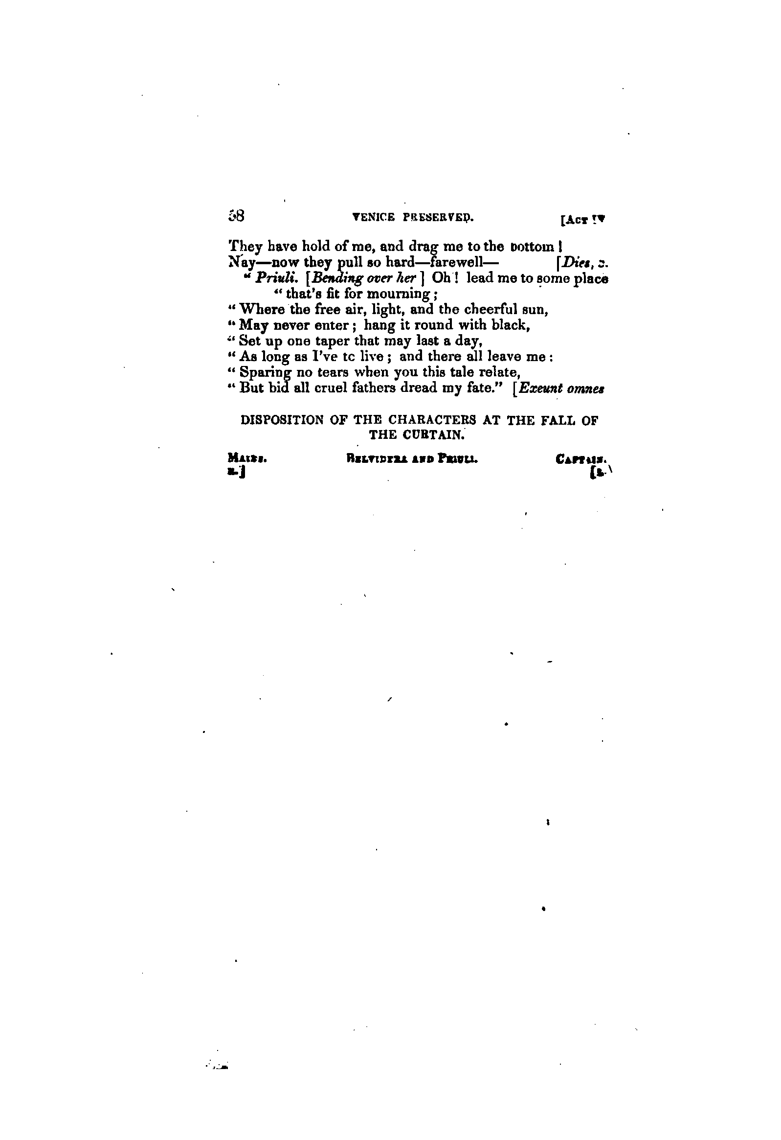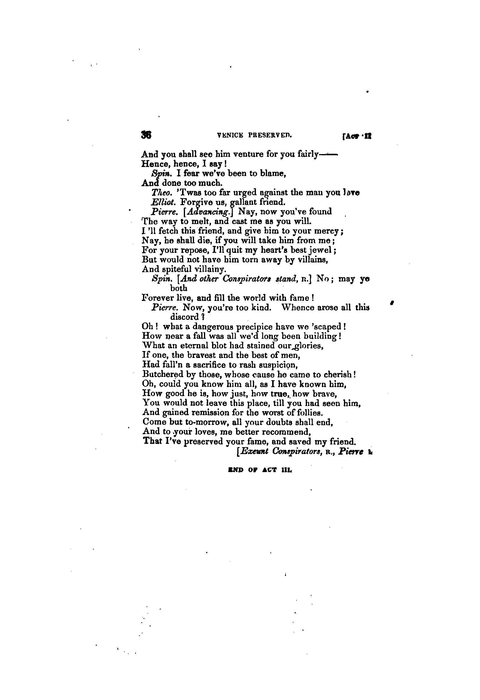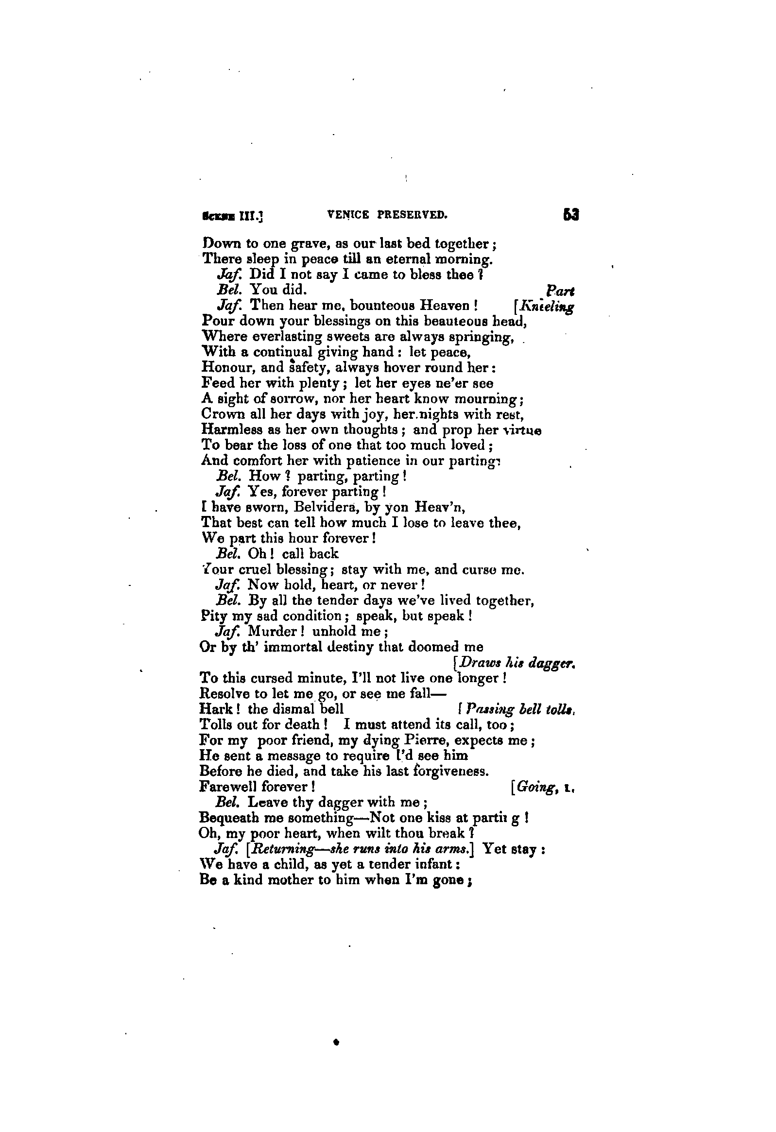 This tragedy is believed to have been originally acted about the year 1682. "Pierre and Jaffier," says Jackson, in his History of the Scottish Stage, "in the estimation of the theatrical world, are equal in rank, and excel each other in representation only, as the particular talents of the actor elevate or lessen, in the idea of the spectator, the importance of whichever part he assumes. I have seen Garrick and Barry alternately in both parts, and the candid critic was doubtful where to bestow the preference. Mr. Mossop, indeed, raised the character of Pierre beyond all reach, and left any Jaffier I ever saw with him at a [v]distance: out, had he attempted Jqffier, I am confident he would with Barry in Pierre, have stood far behind."