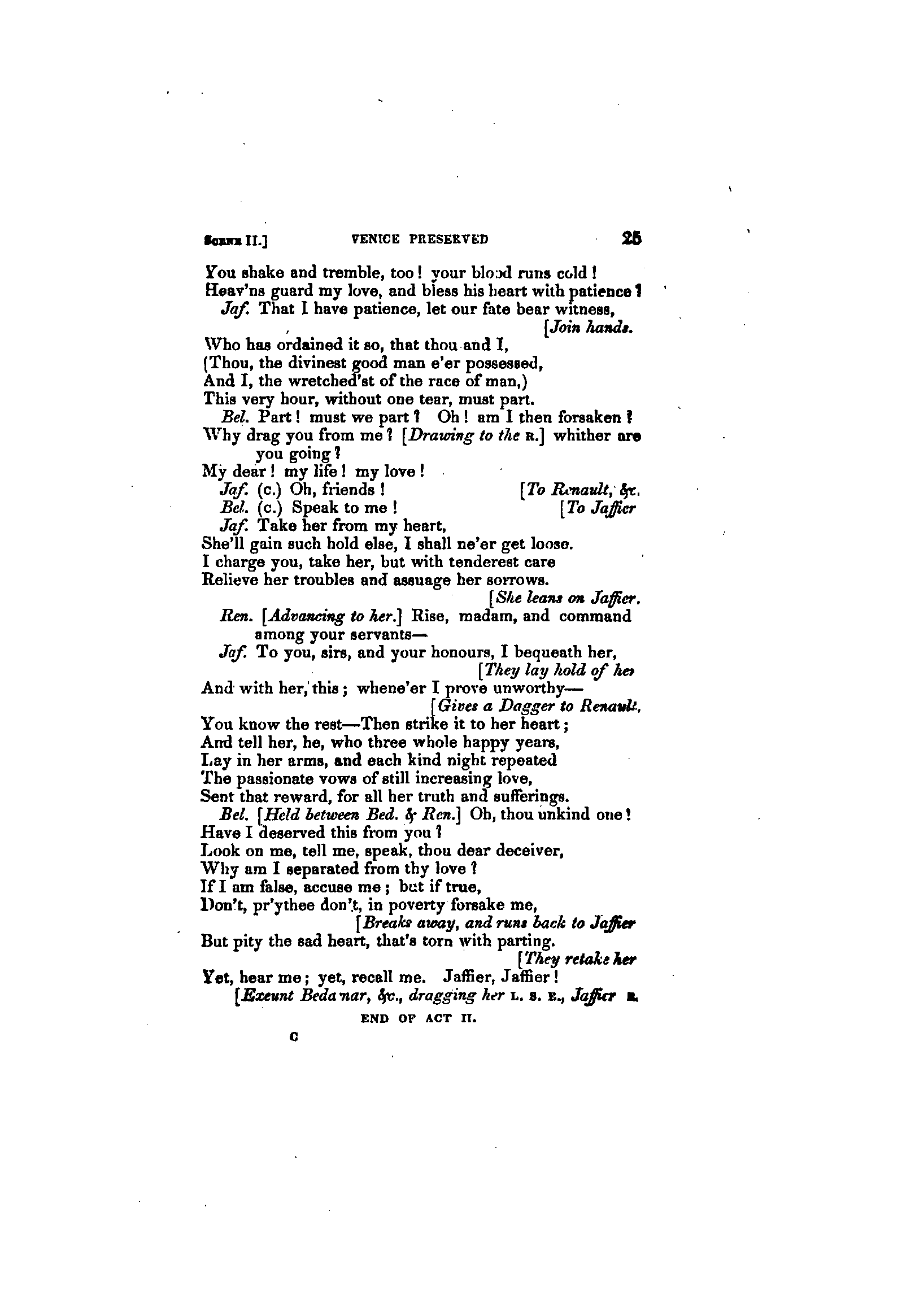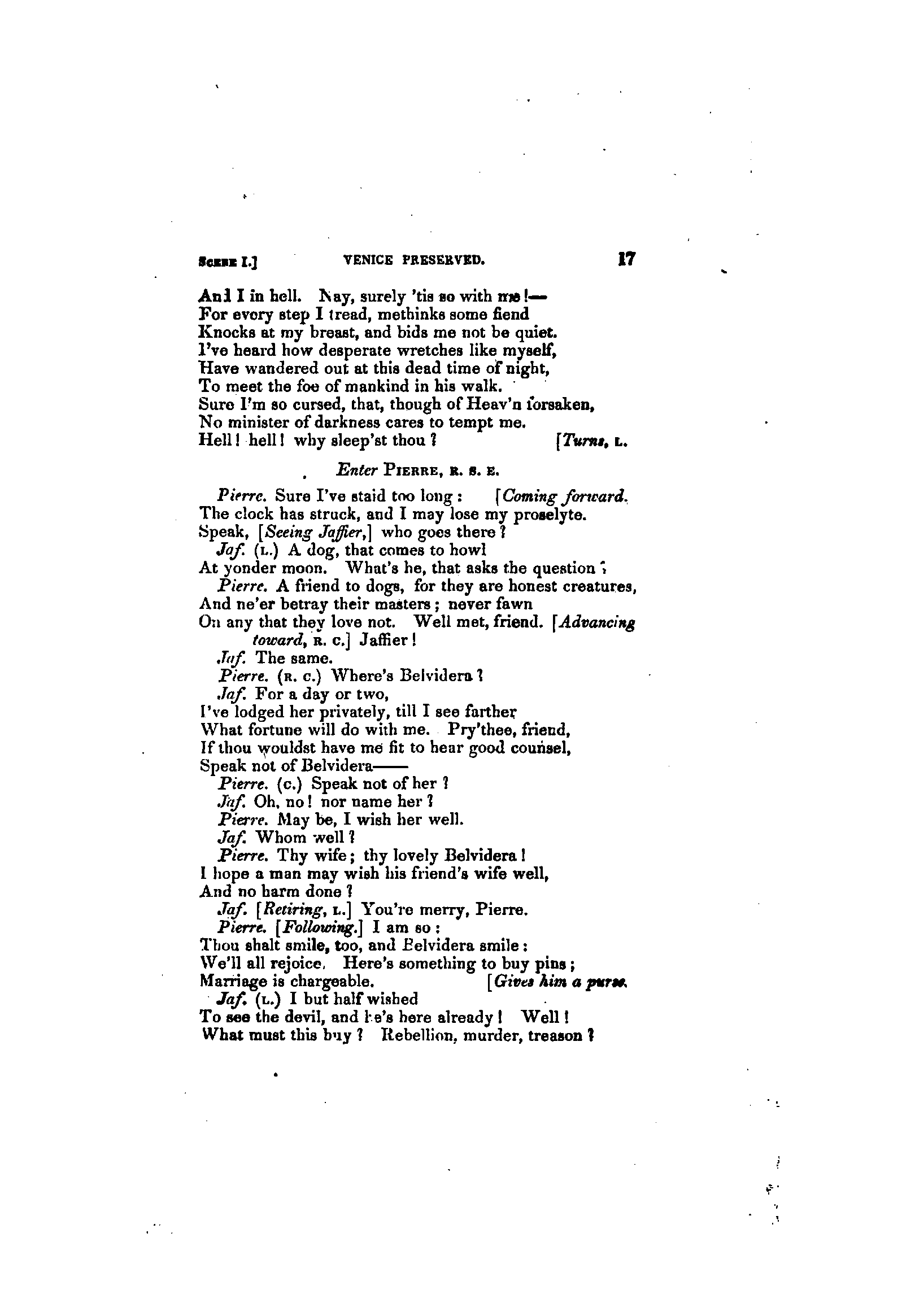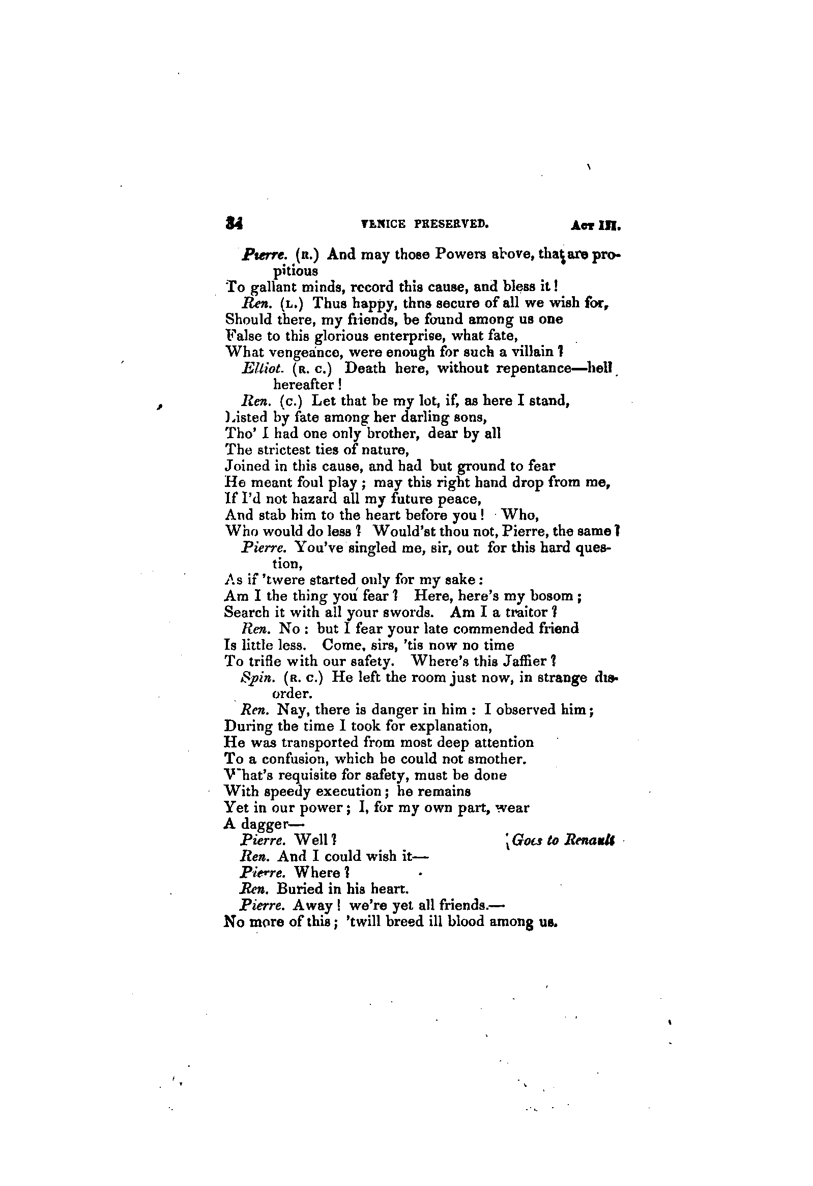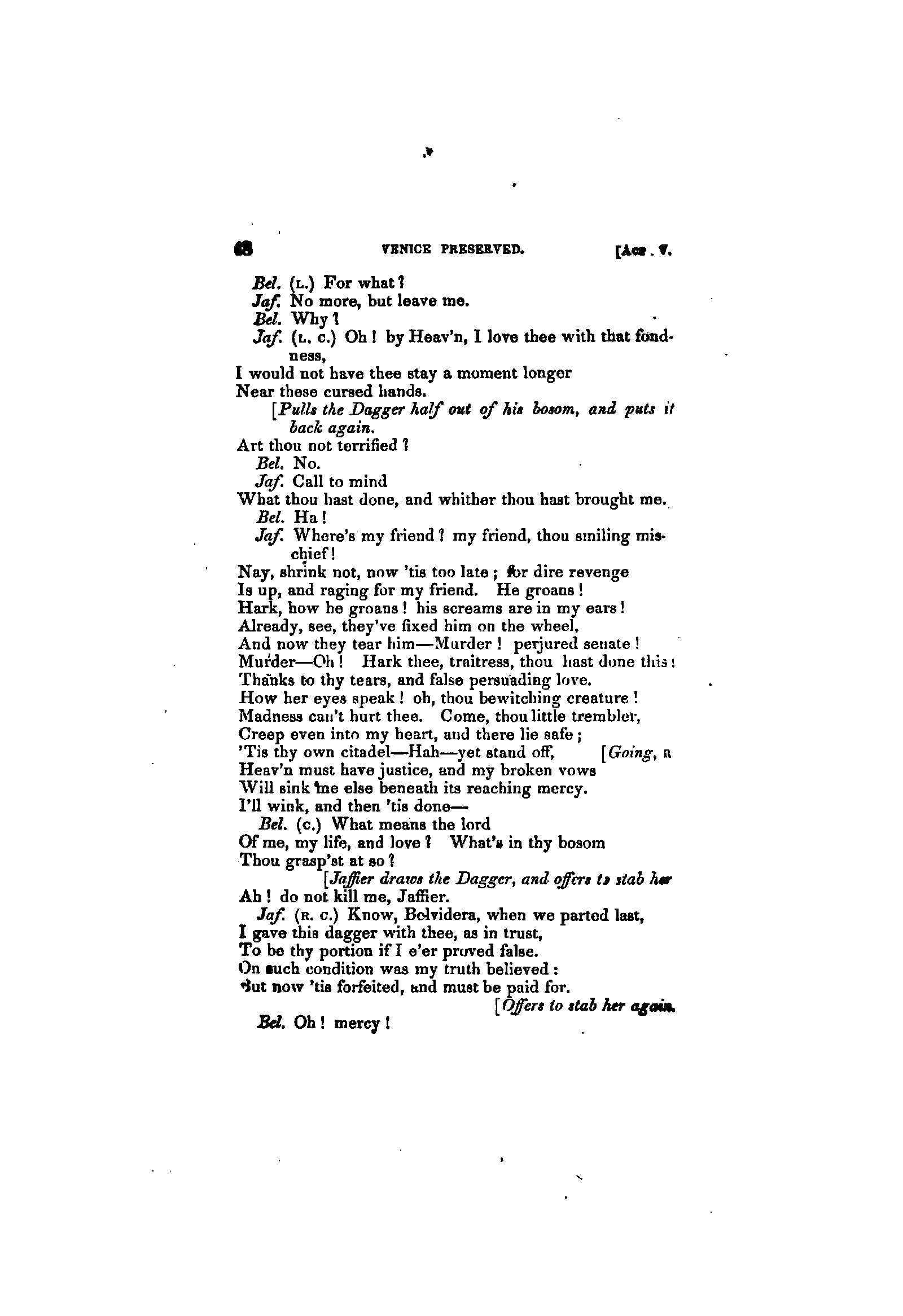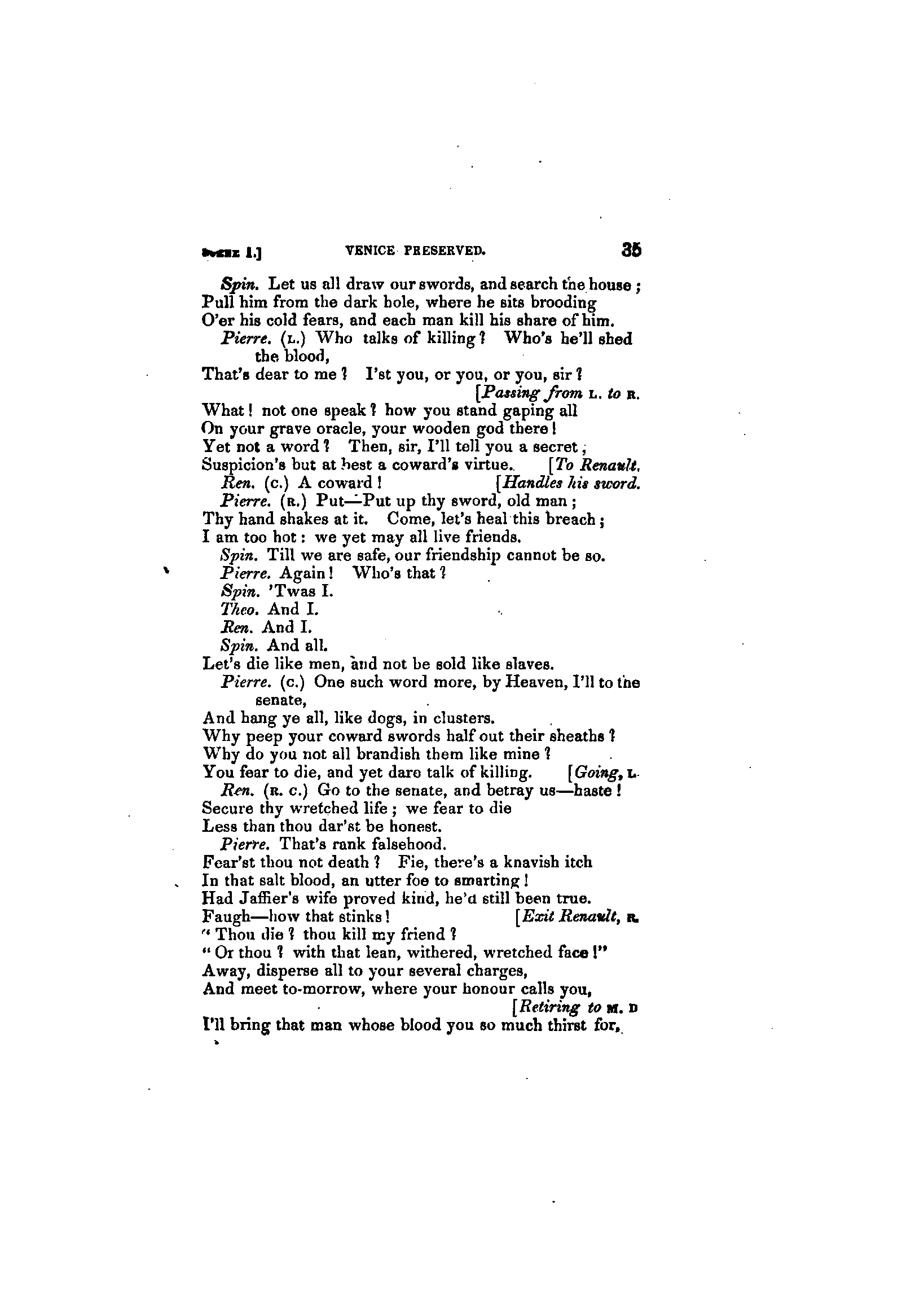 This tragedy is believed to have been originally acted about the year 1682. "Pierre and Jaffier," says Jackson, in his History of the Scottish Stage, "in the estimation of the theatrical world, are equal in rank, and excel each other in representation only, as the particular talents of the actor elevate or lessen, in the idea of the spectator, the importance of whichever part he assumes. I have seen Garrick and Barry alternately in both parts, and the candid critic was doubtful where to bestow the preference. Mr. Mossop, indeed, raised the character of Pierre beyond all reach, and left any Jaffier I ever saw with him at a [v]distance: out, had he attempted Jqffier, I am confident he would with Barry in Pierre, have stood far behind."