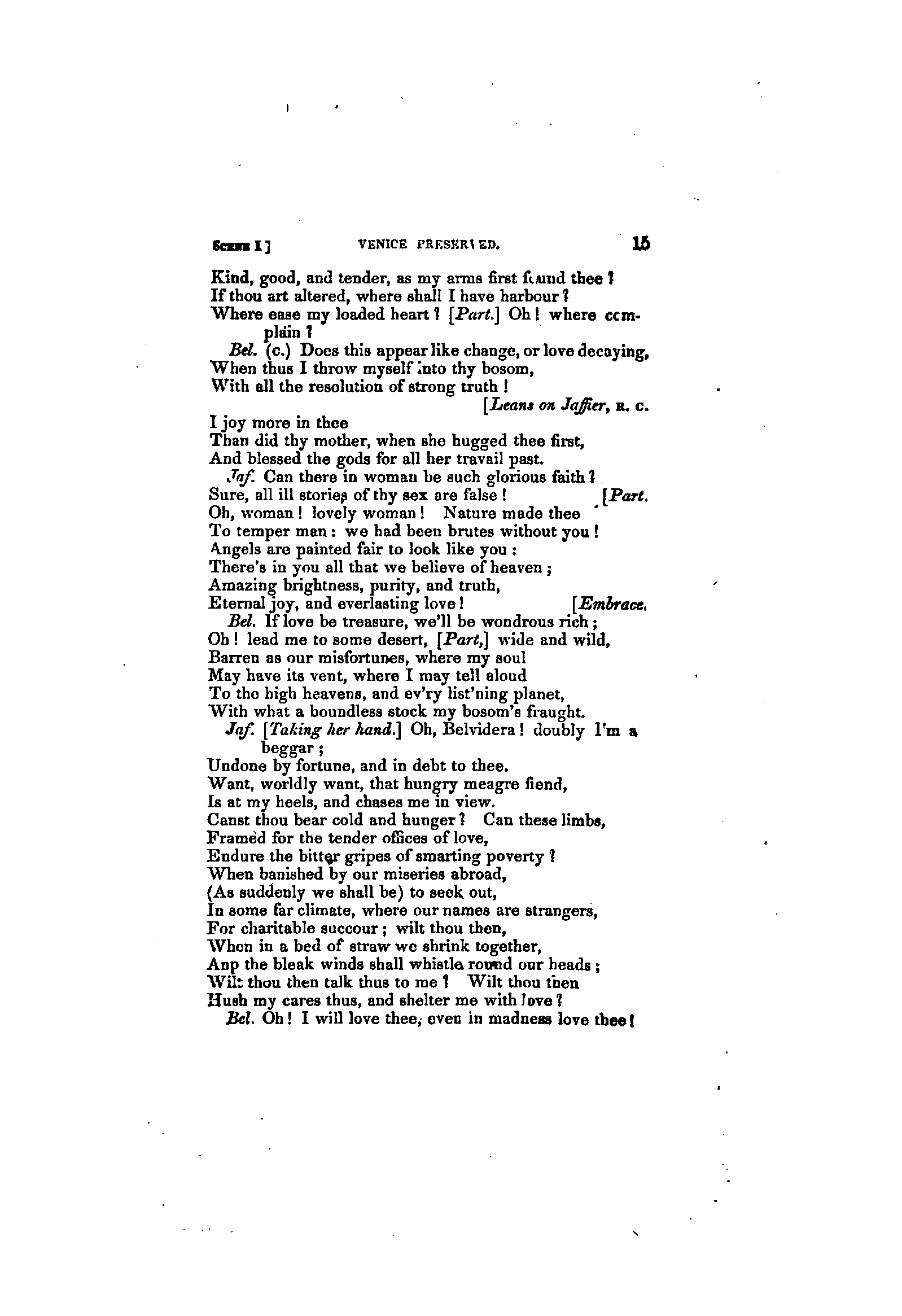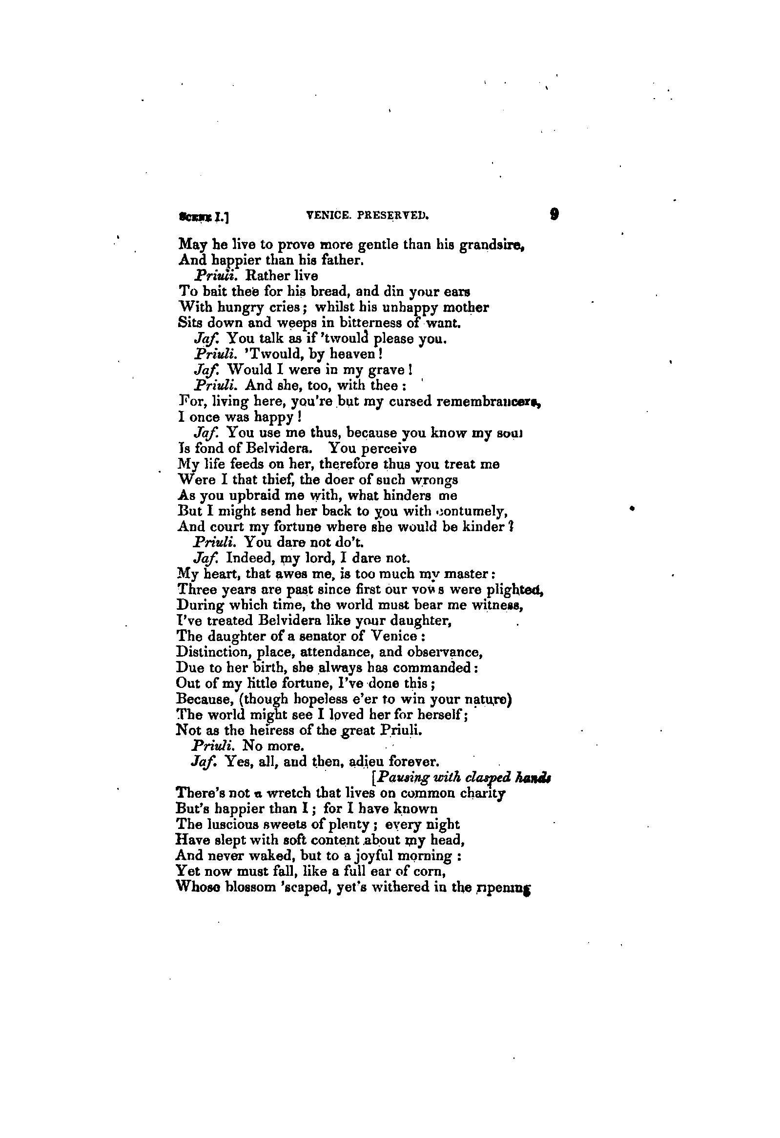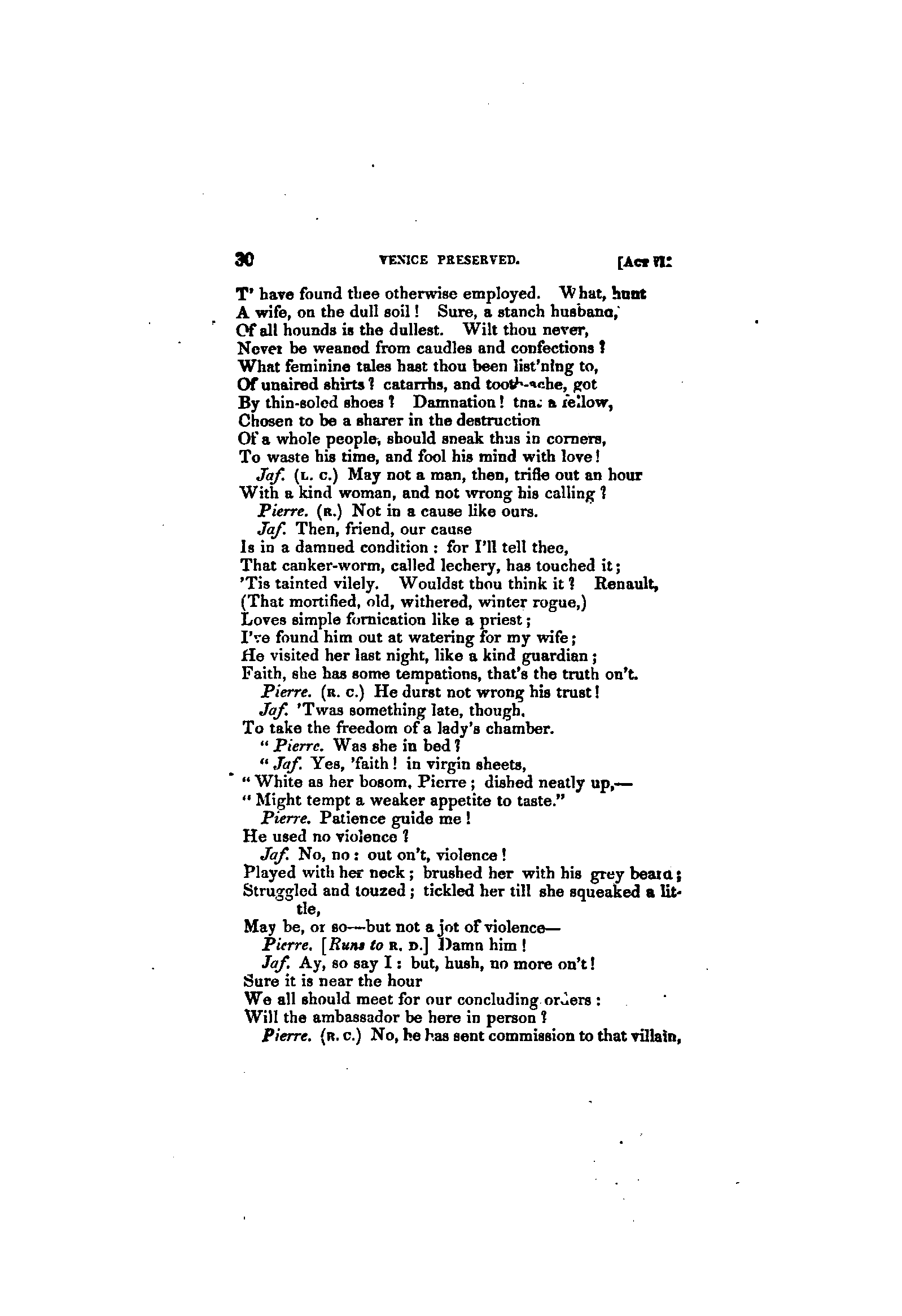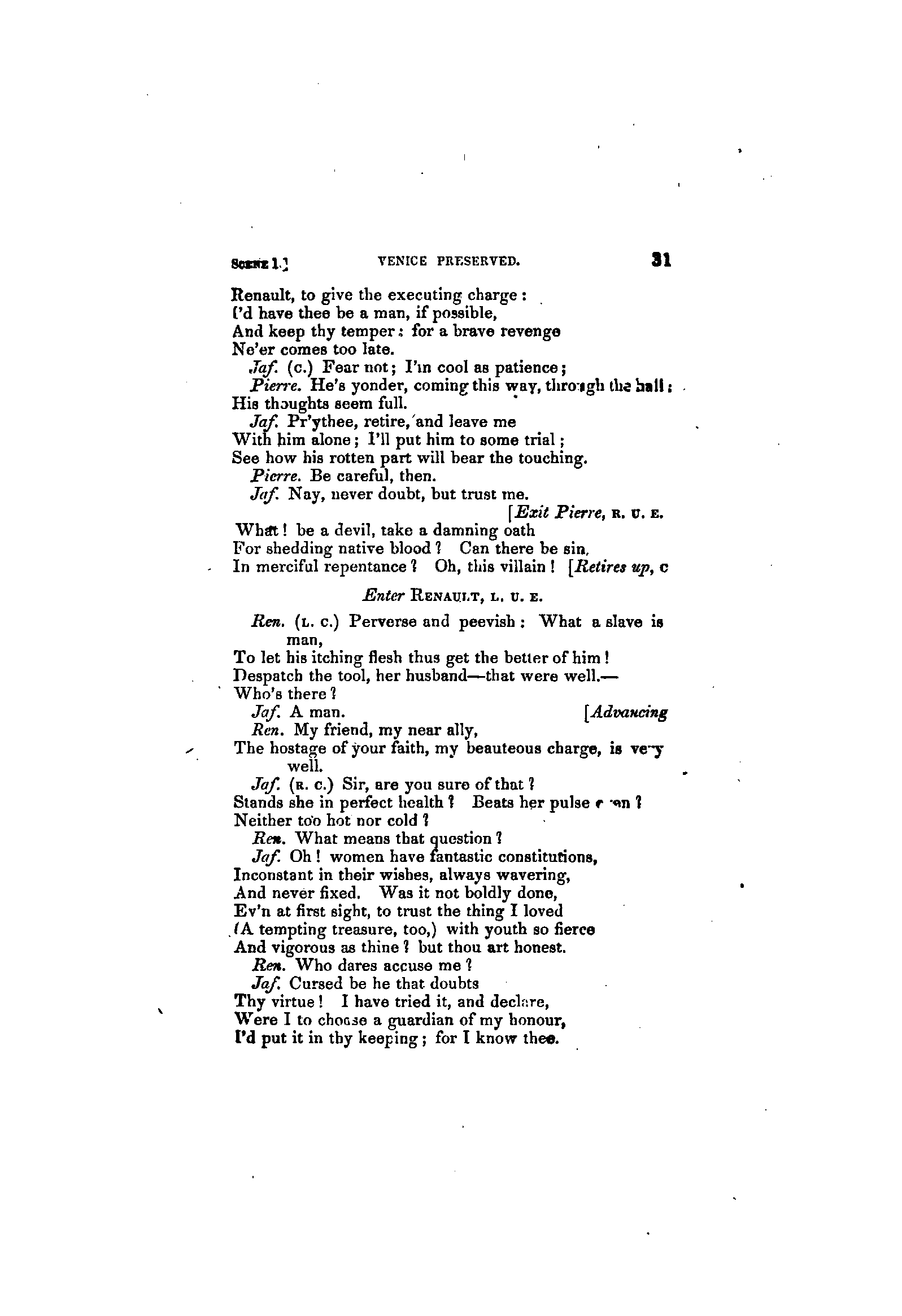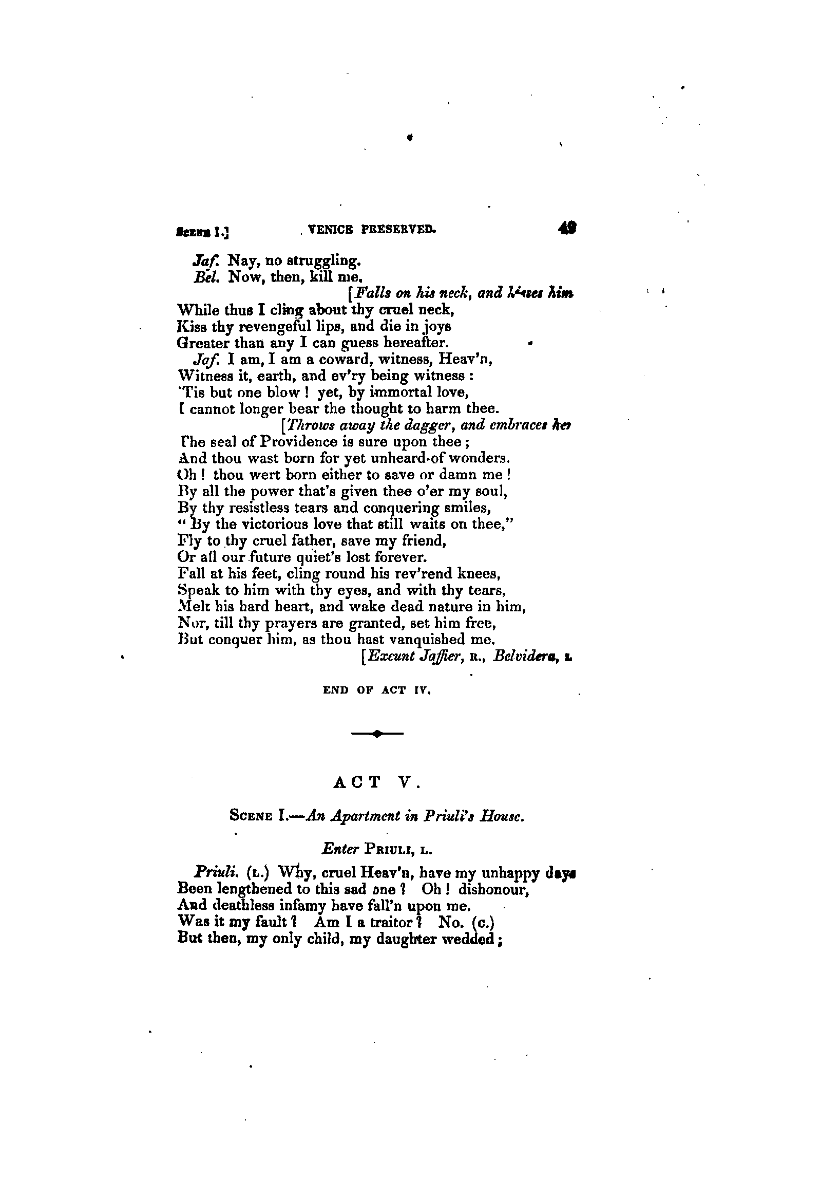 This tragedy is believed to have been originally acted about the year 1682. "Pierre and Jaffier," says Jackson, in his History of the Scottish Stage, "in the estimation of the theatrical world, are equal in rank, and excel each other in representation only, as the particular talents of the actor elevate or lessen, in the idea of the spectator, the importance of whichever part he assumes. I have seen Garrick and Barry alternately in both parts, and the candid critic was doubtful where to bestow the preference. Mr. Mossop, indeed, raised the character of Pierre beyond all reach, and left any Jaffier I ever saw with him at a [v]distance: out, had he attempted Jqffier, I am confident he would with Barry in Pierre, have stood far behind."