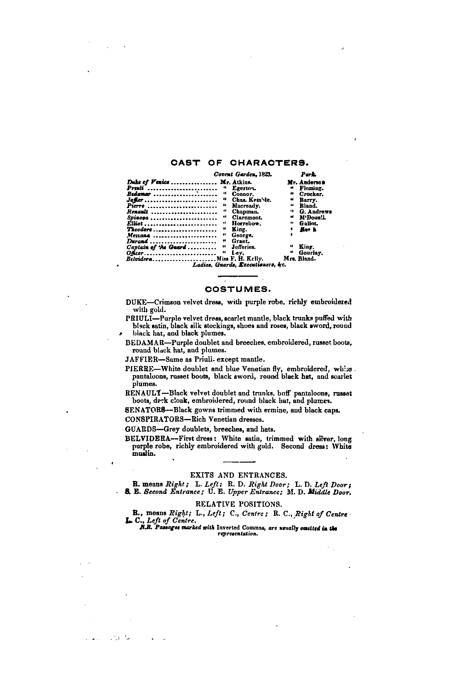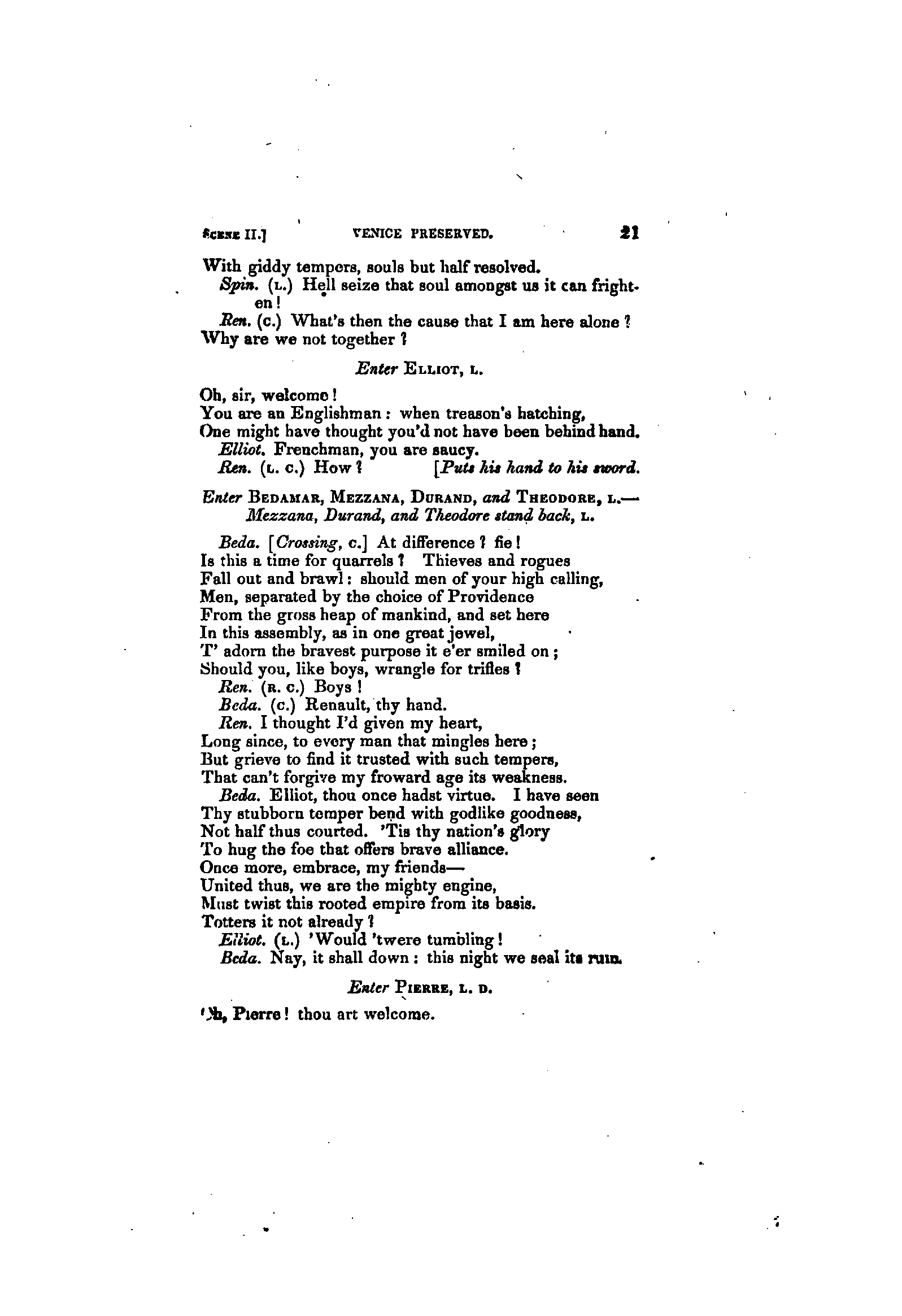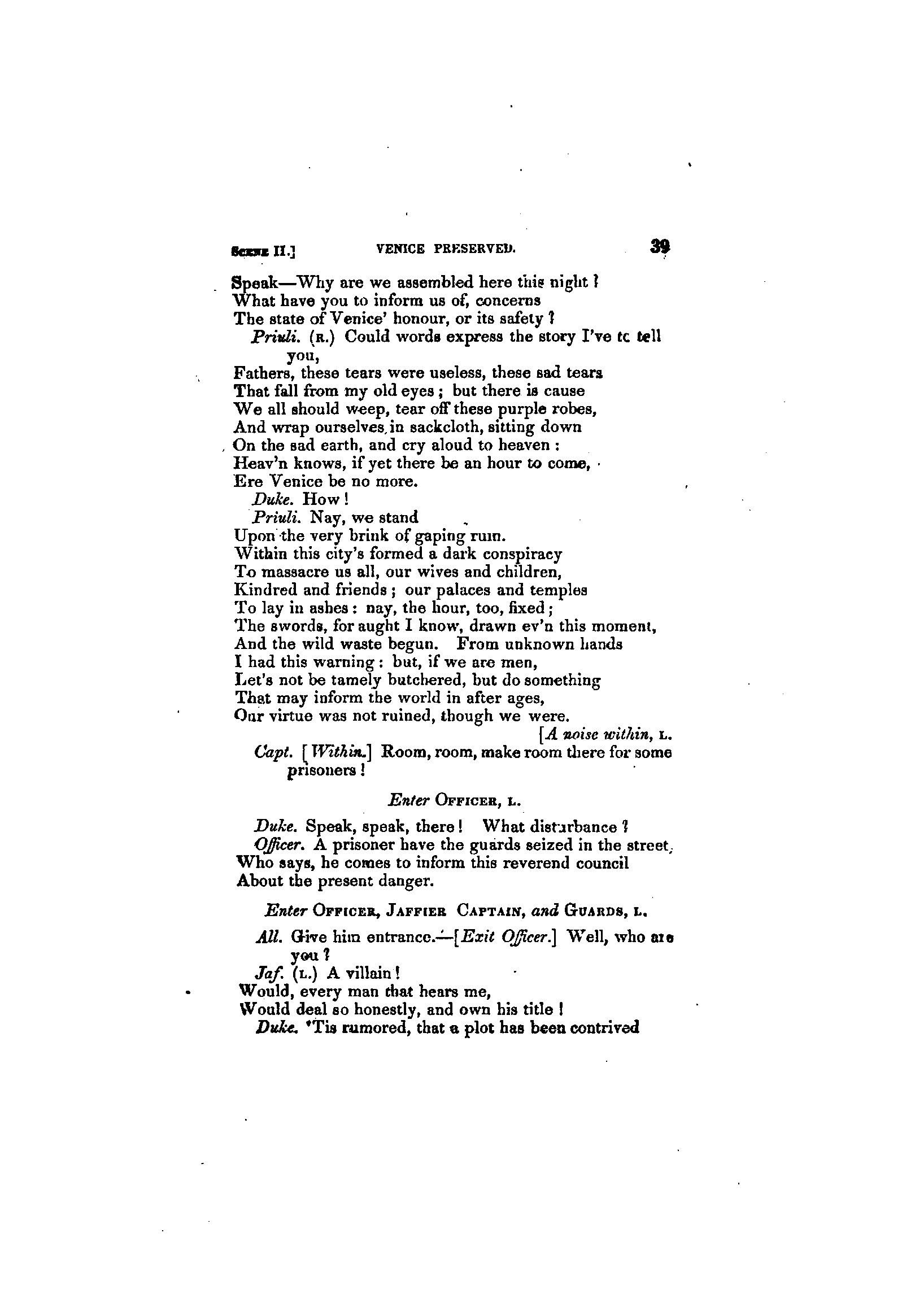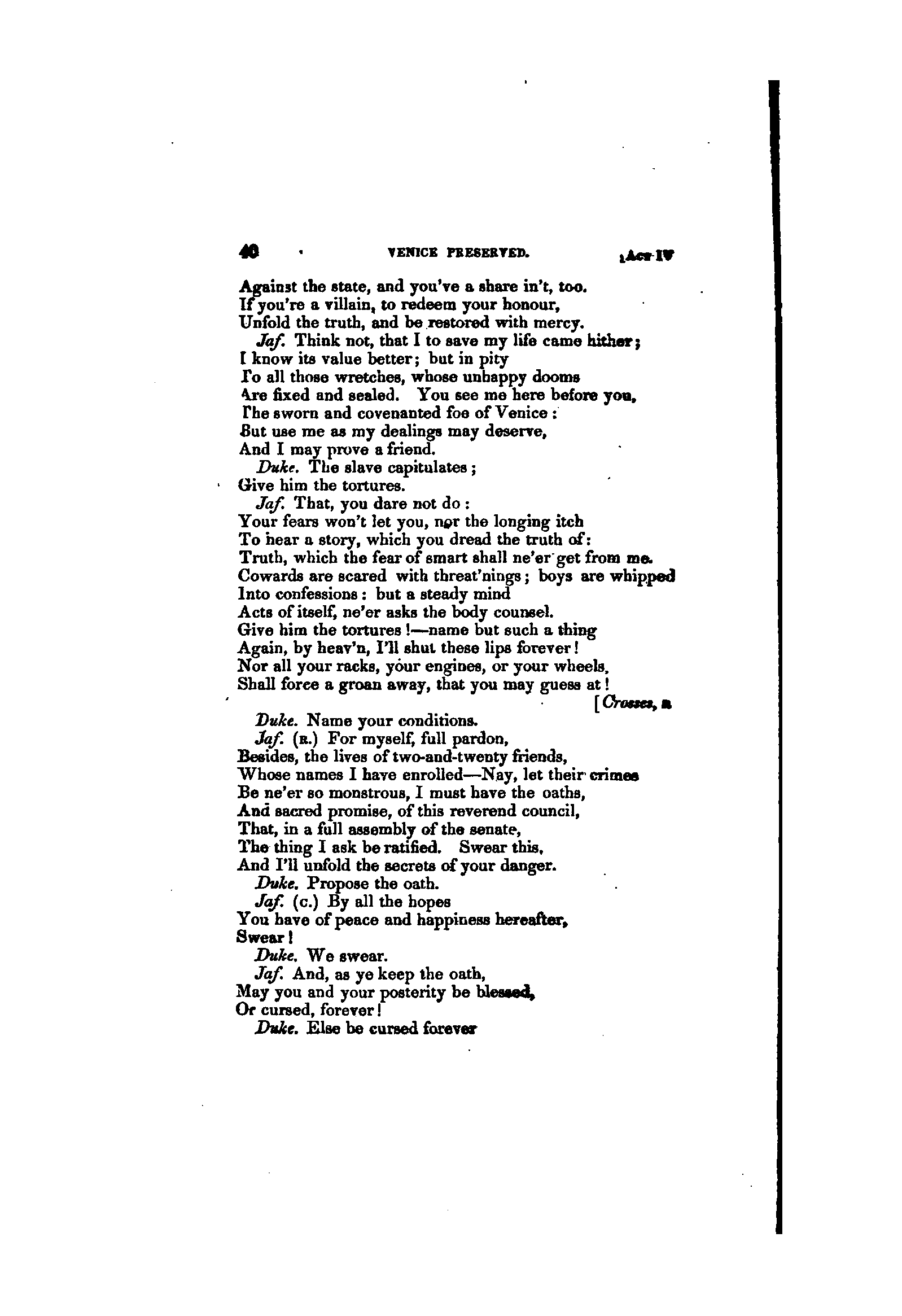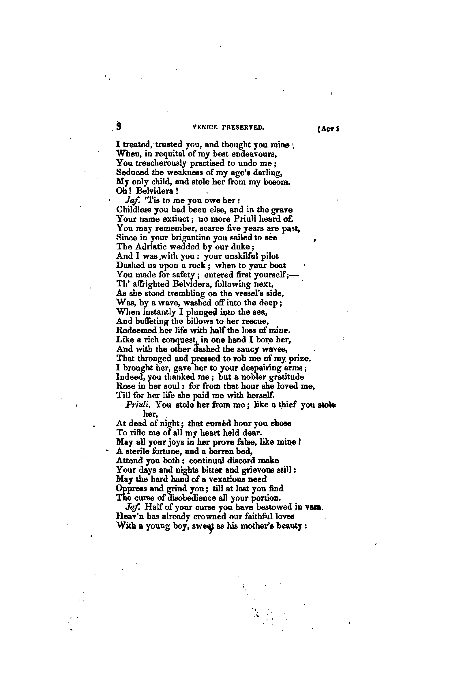 This tragedy is believed to have been originally acted about the year 1682. "Pierre and Jaffier," says Jackson, in his History of the Scottish Stage, "in the estimation of the theatrical world, are equal in rank, and excel each other in representation only, as the particular talents of the actor elevate or lessen, in the idea of the spectator, the importance of whichever part he assumes. I have seen Garrick and Barry alternately in both parts, and the candid critic was doubtful where to bestow the preference. Mr. Mossop, indeed, raised the character of Pierre beyond all reach, and left any Jaffier I ever saw with him at a [v]distance: out, had he attempted Jqffier, I am confident he would with Barry in Pierre, have stood far behind."