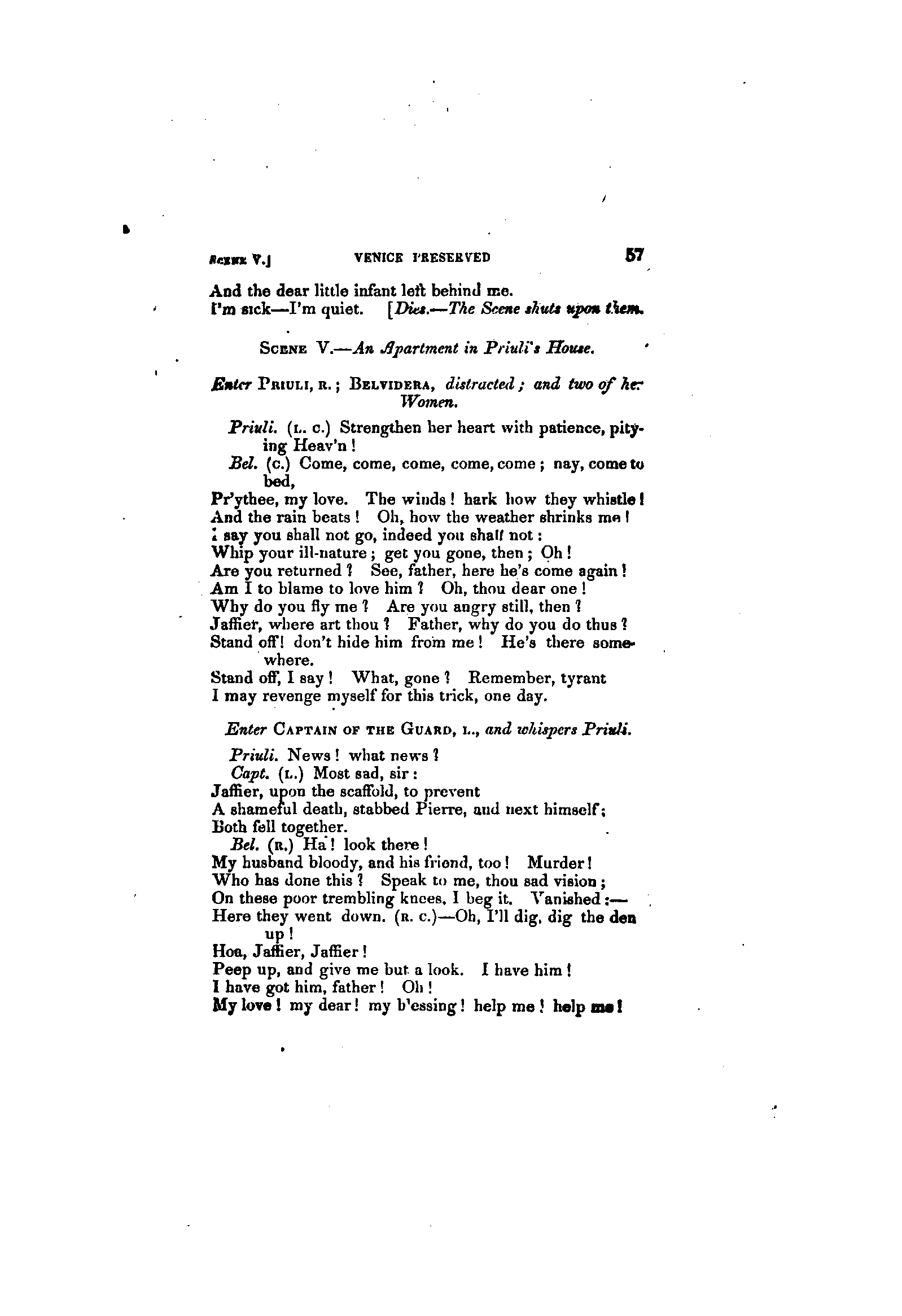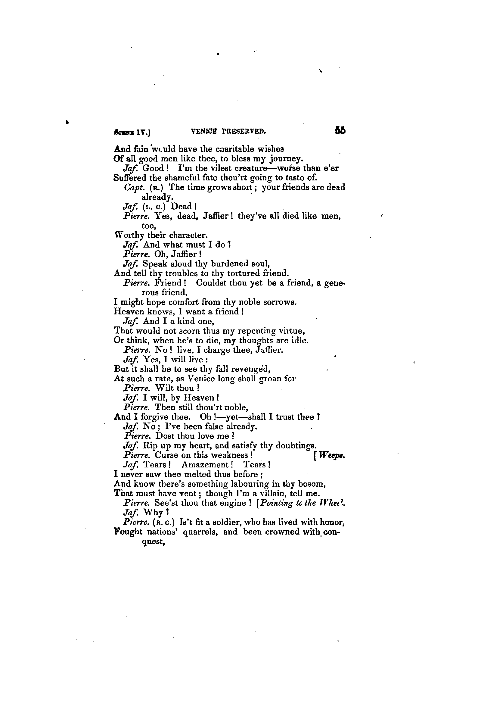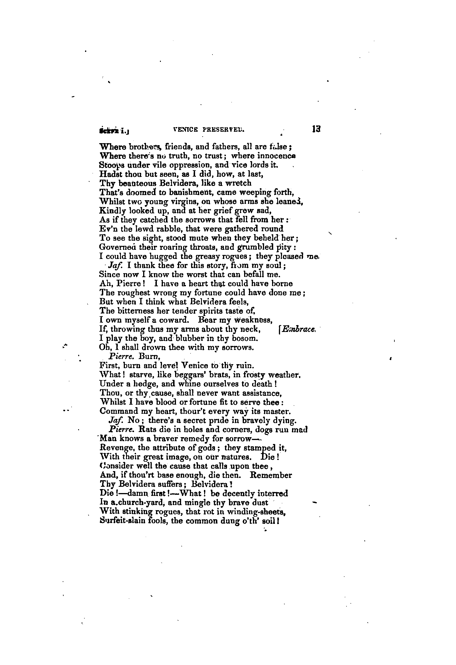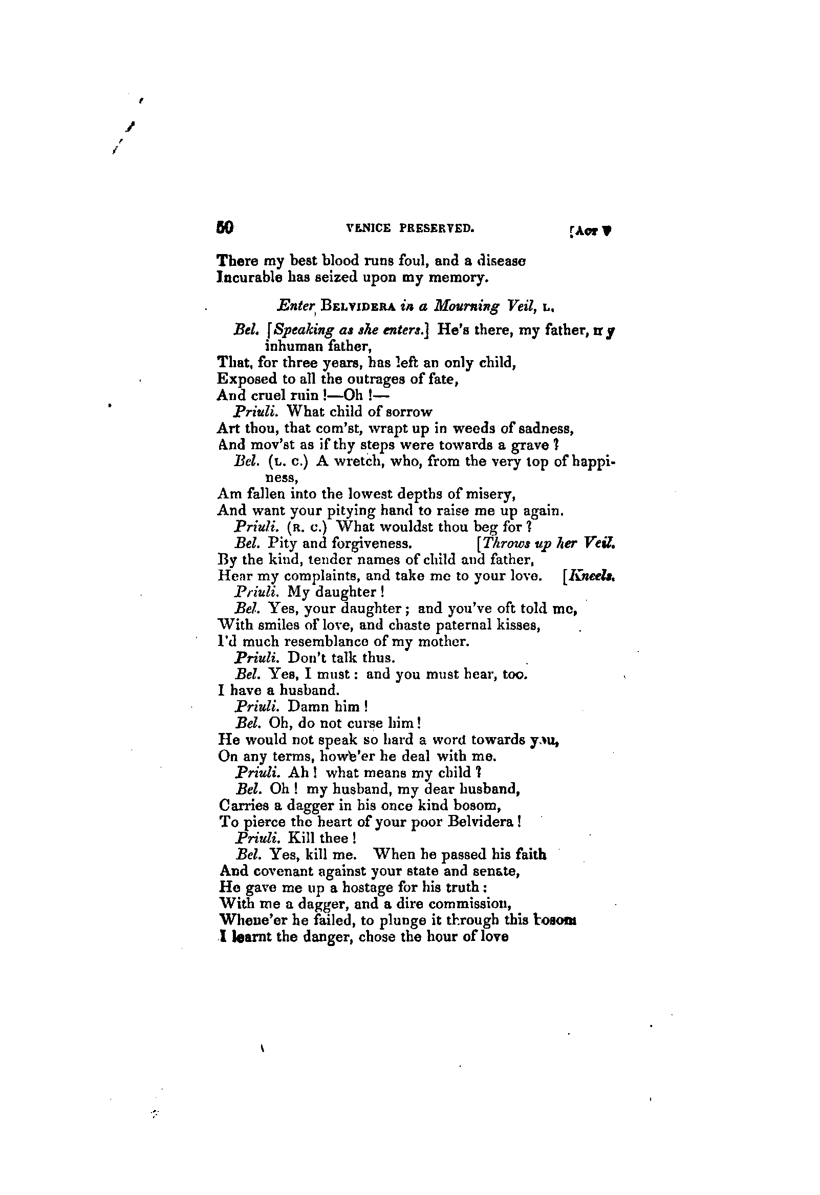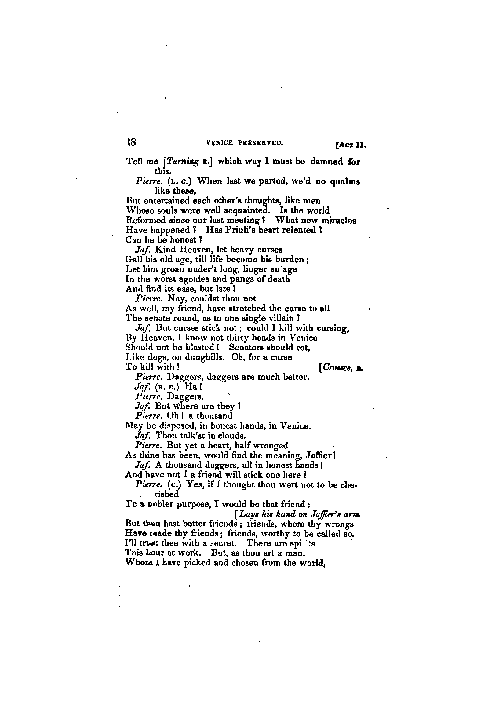 Few plays owe so much to the pruning-knife for their success as this. In its unexpurgated state, "Venice Preserved" leaves an impression far less favorable to the genius, as well as the moral sense of the author, than in its present abridged and rectified shape. In the language of Campbell, "never were beauties and faults more easily separated than those of this tragedy. The latter, in its purification for the stage, came off like dirt from a fine statue, taking away nothing from its symmetrical surface, and leaving us only to wonder how the author himself should have soiled it with such disfigurements. Pierre is a miserable conspirator, as Otway first painted him, impelled to treason by his love of a courtesan and his jealousy of Antonio. But his character, as it now comes forward, is a-mixture of patriotism and excusable misanthropy. Even in the more modern prompt-books, an improving curtailment has been introduced. Until the middle of the last century, the ghosts of Jaffier and Pierre used to come in upon the stage, haunting Belvidera in her last agonies, which, Heaven knows, require no aggravation from spectral agency."