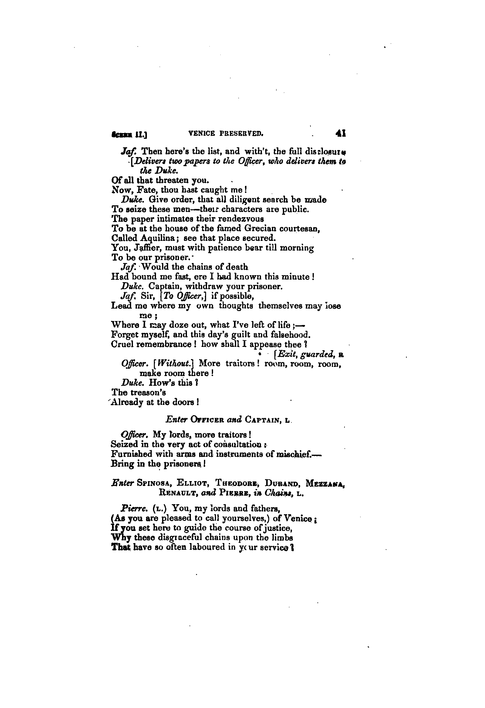 "His fine, full toned voice and strong expression of sentiment, gave uncommon spirit to the warmth and passion of the character. In the interview with the conspirators, in the third act, he threw a gallantry into his action, as striking as it was unexpected. But he greatly excelled in the vehement reproaches, which, in the fourth act, he poured, with acrimony and force, on the treachery and cowardice of Jaffier. The cadences of his voice were equally adapted to the loudest rage and the most deep and solemn reflection, which he judiciously varied." "Mr. Garrick," says Davies, "when fixed in the management of Drury Lane, resigned Pierre, in which part his fire and spirit were not equally supported by grandeur and dignity of person, for Jaffier, which he acted with great and deserved approbation many years." The temporary frenzy, with which Jaffier is seized, in the fourth act, on fancying that he saw his friend on the rack, has not since been equalled, nor, perhaps, ever will.