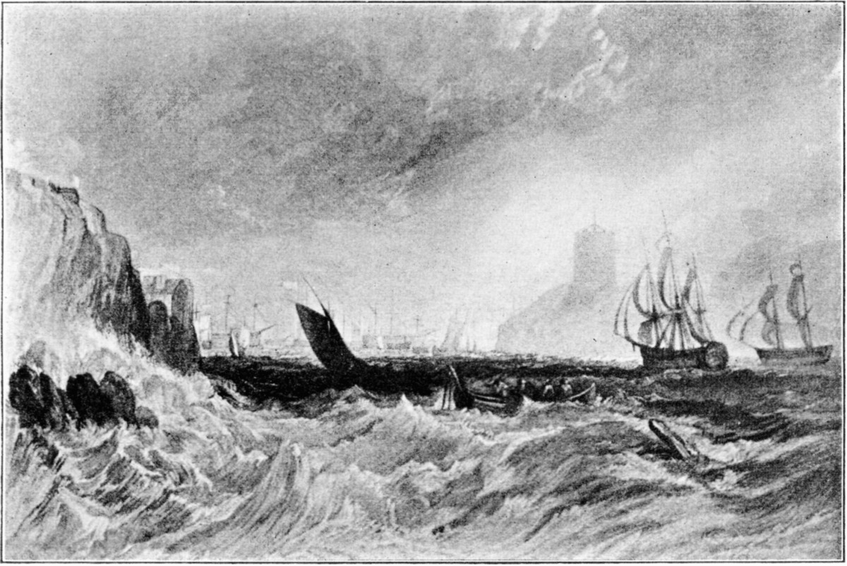 In his own preface Mr. Ruskin has told us all that in 1856 it was necessary to know of the genesis of the Harbors. That account may now be supplemented with the following additional facts. In 1826 Turner (in conjunction with Lupton, the engraver) projected and commenced a serial publication entitled The Ports of England. But both artist and engraver lacked the opportunity required to carry the undertaking to a successful conclusion, and three numbers only were completed. Each of these contained two engravings. Part I., introducing Scarborough and Whitby, duly appeared in 1826; Part II., with Dover and Ramsgate, in 1827; and [vi]in 1828 Part III., containing Sheerness and Portsmouth, closed the series.[A] Twenty-eight years afterwards (that is, in 1856, five years after Turner's death) these six plates, together with six new ones, were published by Messrs. E. Gambart & Co., at whose invitation Mr. Ruskin consented to write the essay on Turner's marine painting which accompanied them. The book, a handsome folio, appears to have been immediately successful, for in the following year a second edition was called for. This was a precise reprint of the 1856 edition; but, unhappily, the delicate plates already began to exhibit signs of wear. The copyright (which had not been retained by Mr. Ruskin, but remained the property of Messrs. E. Gambart & Co.) then passed to Messrs. Day & Son, who, after producing the third edition of 1859, in turn disposed of it to Mr. T. J. Allman. Allman issued a fourth edition in 1872, and then parted with his rights to Messrs. Smith, Elder & Co., who in 1877 brought out the fifth, and, until now, last edition. Since that date the work has been out of print, and has remained practically inaccessible to the ordinary reader.