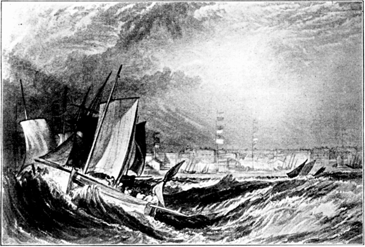 I have only to state, in conclusion, that these twelve drawings of the Harbors of England are more representable by engraving than most of his works. Few parts of them are brilliant in color; they were executed chiefly in brown and blue, and with more direct reference to the future engraving than was common with Turner. They are also small in size, generally of the exact dimensions of the plate, and therefore the lines of the compositions are not spoiled by contraction; while finally, the touch of the painter's hand upon the wave-surface is far better imitated by mezzotint engraving than by any of the ordinary expedients of line. Take them all in all, they form the most valuable series of marine studies which have as yet been published from his works; and I hope [33]that they may be of some use hereafter in recalling the ordinary aspect of our English seas, at the exact period when the nation had done its utmost in the wooden and woven strength of ships, and had most perfectly fulfilled the old and noble prophecy—
