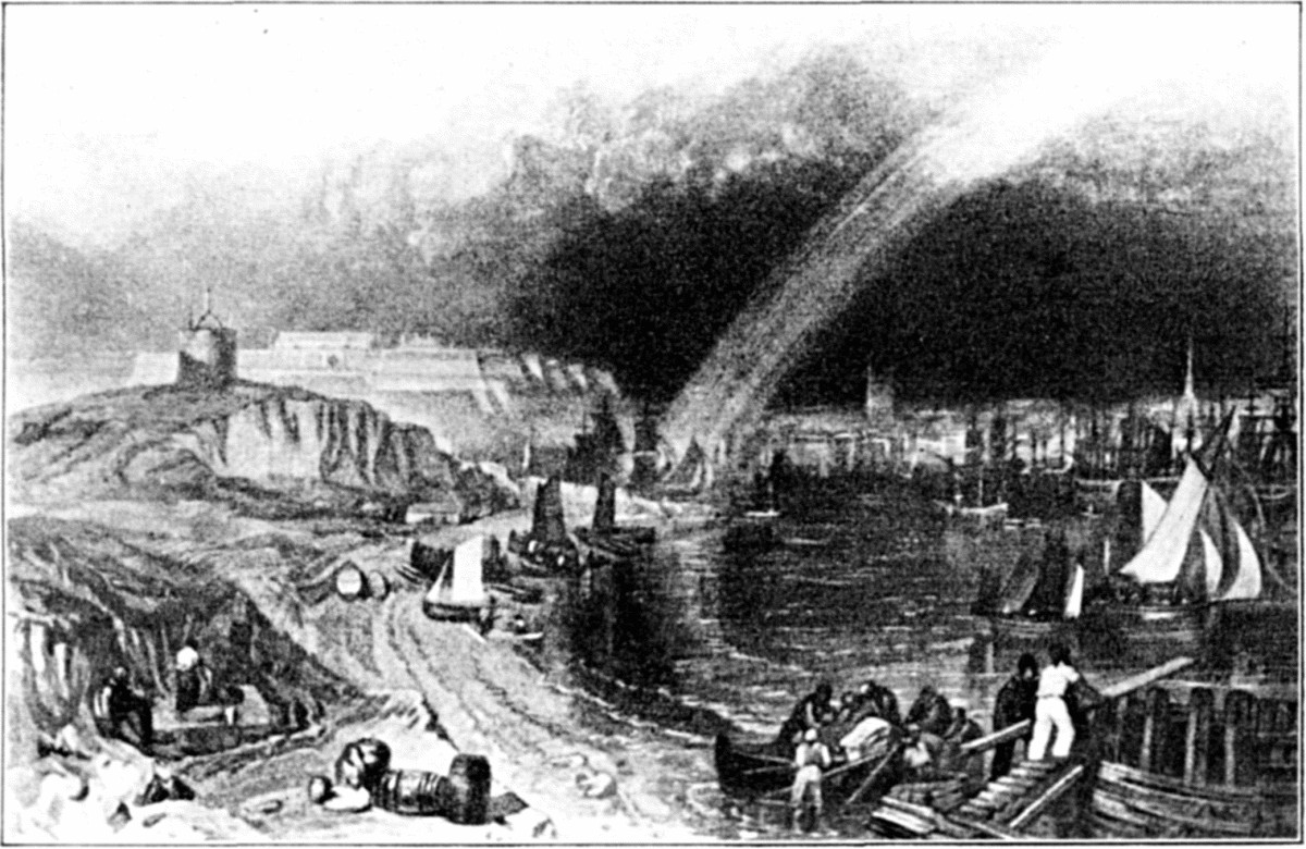 The drawing for this plate is one of Turner's most remarkable, though not most meritorious, works: it contains the brightest rainbow he ever painted, to my knowledge; not the best, but the most dazzling. It has been much modified in the plate. It is very like one of Turner's pieces of caprice to introduce a rainbow at all as a principal feature in such a scene; for it is not through the colors of the iris that we generally expect to be shown eighteen-pounder batteries and ninety-gun ships.