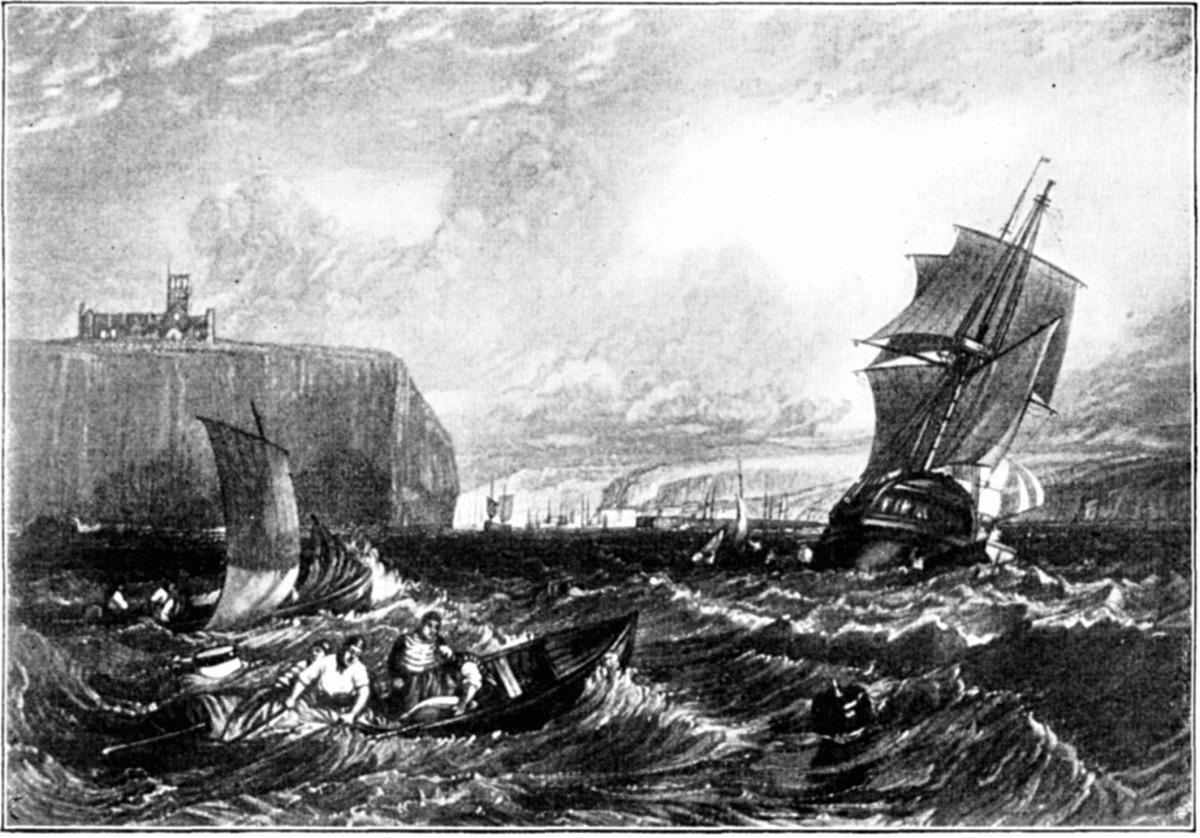 Turner was always fond of this neat, courageous, benevolent, merry, methodical Deal. He painted it very early, in the Southern Coast series, insisting on one of the tavern windows as the principal subject, with a flash of forked lightning streaming beyond it out at sea like a narrow flag. He has the same association in his mind in the present plate; disorder and distress among the ships on the left, with the boat going out to help them; and the precision of the little town stretching in sunshine along the beach.