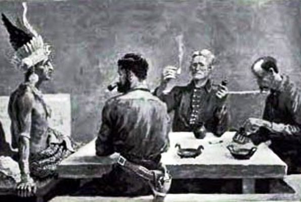 Fortunately, a little spring came out from the rock, clear and cool, just inside the cave; and game was so abundant on that mountain-side that Young came back presently from a foraging expedition with half a dozen codornices, that he had come so close to as to shoot with his revolver, and a jack-rabbit that he actually had caught with his hands as it jumped up almost beneath his feet; which excellent fare made a most satisfying supper for all of us; and eating it so added to Rayburn's strength—as we could tell by the fuller tones of his voice, and by his being able to move a little on his bed without our helping him—as to rouse in us a warm hope that the death that seemed so near to him might yet be thrust away. Our chief concern, lest the shock that would come to him of knowing it should fairly kill him, was to hide from him for the present the knowledge that Fray Antonio was dead; and to compass this end we plumply told him the flat-footed lie that the monk had gone on in search of some town whence he might bring back horses and supplies; and so, for a time, we laid at rest his doubts.