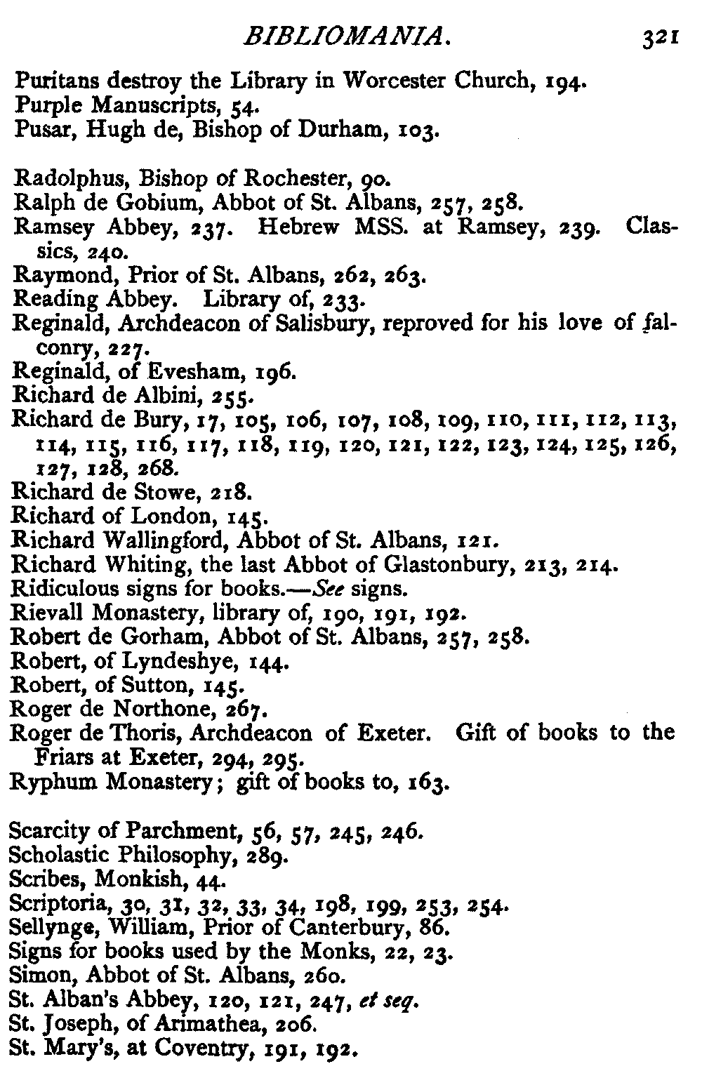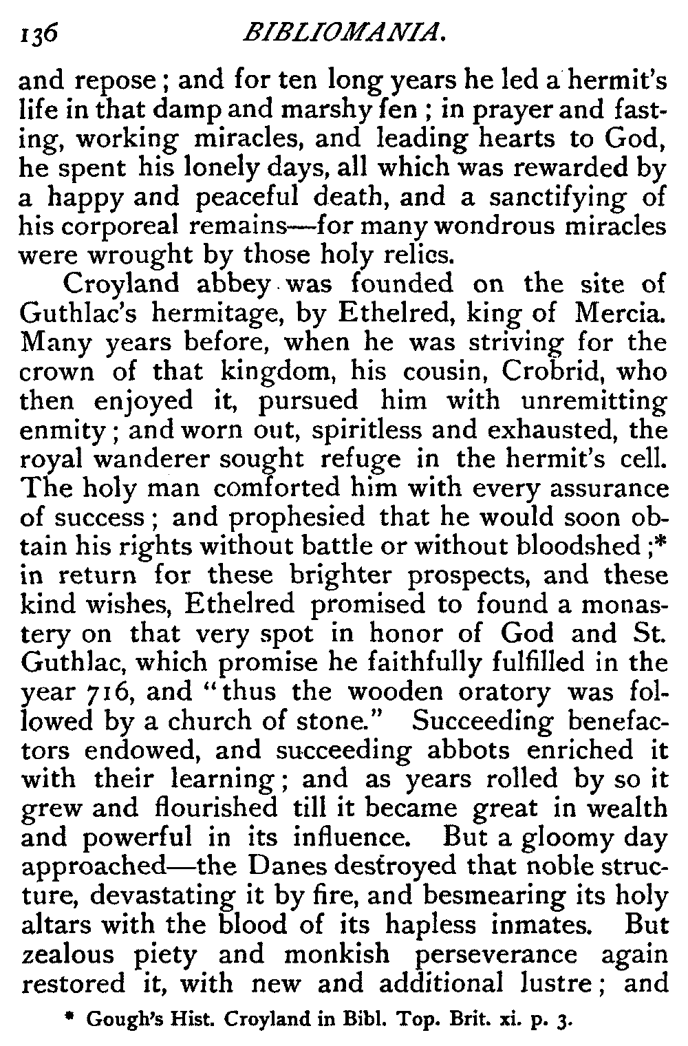 Moreover as to the simple question—Were the monks booklovers? enough I think as been said to prove it, but the enquiry is far from exhausted; and if the reader should deem the matter still equivocal and undecided, he must refer the blame to the feebleness of my pen, rather than to the barrenness of my subject. But let him not fail to mark well the instances I have given; let him look at Benedict Biscop and his foreign travels after[308] books; at Theodore and the early Saxons of the seventh century; at Boniface, Alcuin, Ælfric, and the numerous votaries of bibliomania who flourished then. Look at the well stored libraries of St. Albans, Canterbury, Ramsey, Durham, Croyland, Peterborough, Glastonbury, and their thousand tomes of parchment literature. Look at Richard de Bury and his sweet little work on biographical experience; at Whethamstede and his industrious pen; read the rules of monastic orders; the book of Cassian; the regulations of St. Augustine; Benedict Fulgentius; and the ancient admonitions of many other holy and ascetic men. Search over the remnants and shreds of information which have escaped the ravages of time, and the havoc of cruel invasions relative to these things. Attend to the import of these small still whisperings of a forgotten age; and then, letting the eye traverse down the stream of time, mark the great advent of the Reformation; that wide gulf of monkish erudition in which was swallowed "whole shyppes full" of olden literature; think well and deeply over the huge bonfires of Henry's reign, the flames of which were kindled by the libraries which monkish industry had transcribed. A merry sound no doubt, was the crackling of those "popish books" for protestant ears to feed upon!