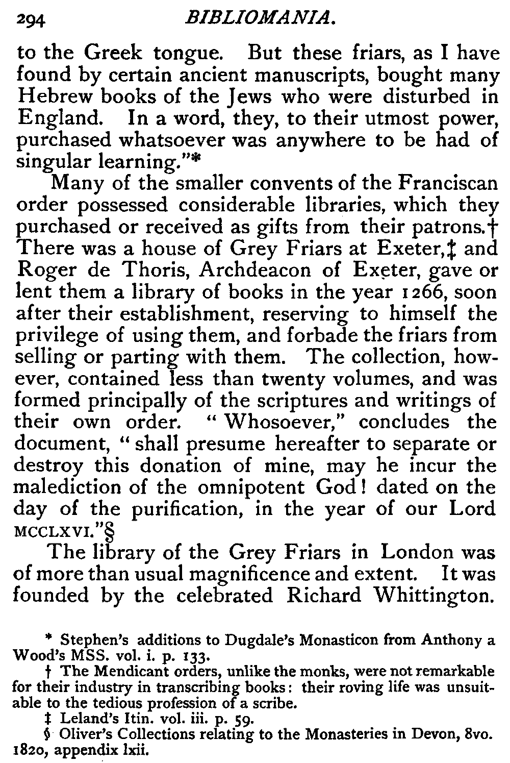 Many of the smaller convents of the Franciscan order possessed considerable libraries, which they purchased or received as gifts from their patrons.[452] There was a house of Grey Friars at Exeter,[453] and Roger de Thoris, Archdeacon of Exeter, gave or lent them a library of books in the year 1266, soon after their establishment, reserving to himself the privilege of using them, and forbade the friars from selling or parting with them. The collection, however, contained less than twenty volumes, and was formed principally of the scriptures and writings of their own order. "Whosoever," concludes the document, "shall presume hereafter to separate or destroy this donation of mine, may he incur the malediction of the omnipotent God! dated on the day of the purification, in the year of our Lord mcclxvi."[454]